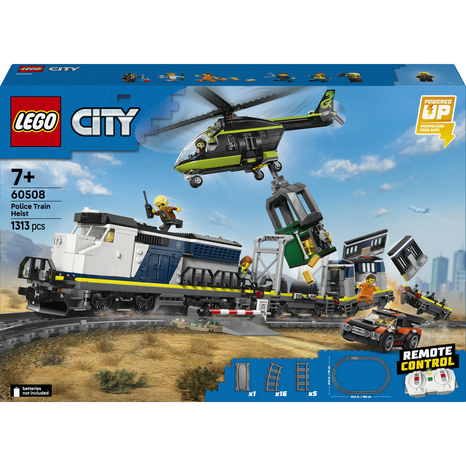 Nastupte do palubu modelu LEGO® City Loupež v policejním vlaku (60508) pro děti od 7 let a zažijte nekonečnou akci. Tato elektrická vlaková souprava s funkcí Powered Up pro děti obsahuje funkční lokomotivu a 3 plošinové vozy, které přepravují vězeňskou celu, bankovní trezor a závodní auto. Stavebnice obsahuje také oválnou železniční trať s přejezdem a kolejnicí pro opětovné nasazení vlaků na koleje. Přidejte model vrtulníku s funkčním drapákem a minifigurky detektiva, policisty, strojvůdce a 3 zločinců, a pusťte se do fantastických dobrodružství plných vlakových loupeží. Tato stavebnice vlaku představuje skvělé překvapení nebo dárek k narozeninám pro děti od 7 let, které milují modely vláčků a stavění z kostek LEGO. Děti můžou tuto stavebnici zkombinovat s dalšími modely z řady LEGO City (prodávají se samostatně) a zažít ještě více dobrodružství. Děti si užijí stavění modelu policejního vlaku LEGO City s intuitivní aplikací LEGO Builder, která jim umožňuje přibližovat a otáčet modelve 3D a ukládat a sledovat postup stavění. Stavebnice obsahuje 1 313 dílků.