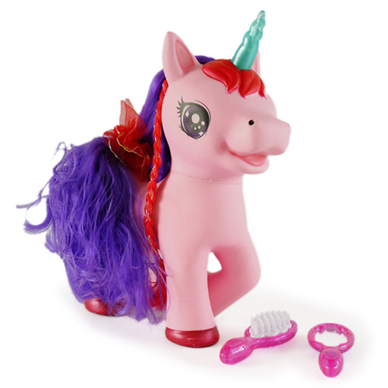 Jednorożec na baterie z akcesoriami. Po naciśnięciu przycisku na brzuszku jednorożca zaczyna on wydawać dźwięki i śpiewać angielską piosenkę, a róg świeci się podczas wydawania dźwięków. Grzebień z akcesoriami do rozczesywania długiej grzywy.
