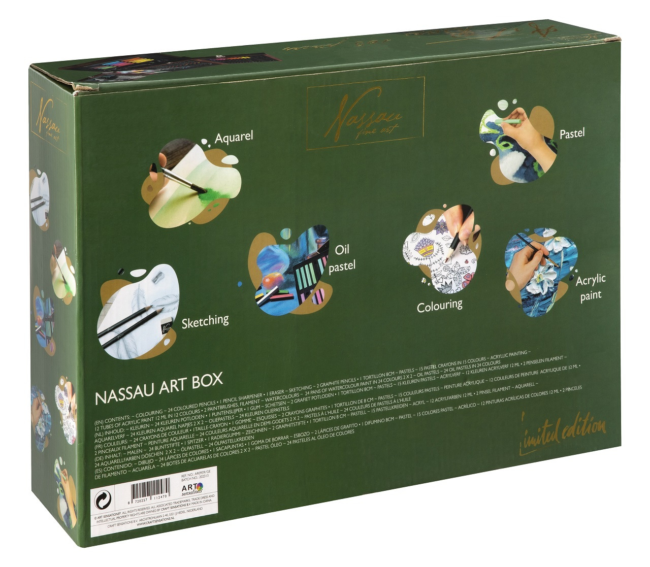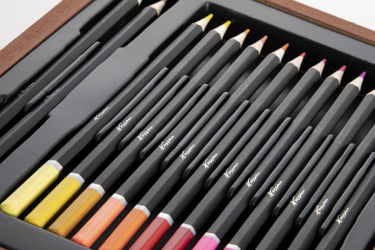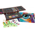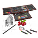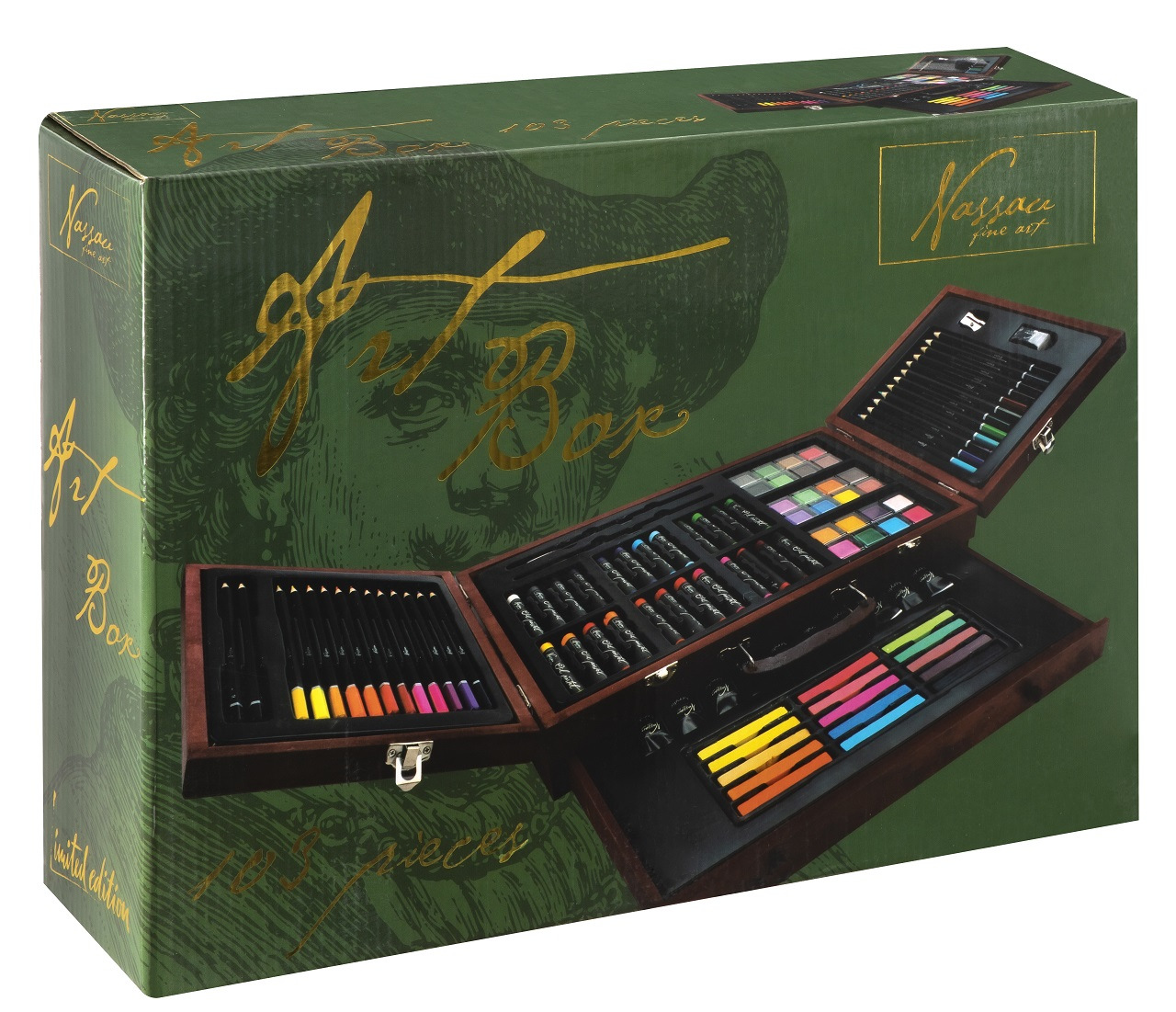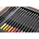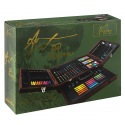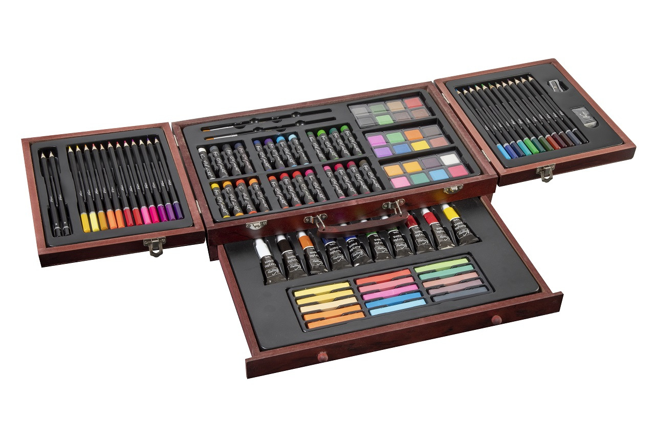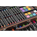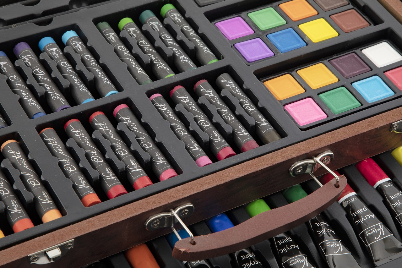 Duży zestaw do rysowania i malowania. Kredki, farby wodne…. Wszystko przechowywane w drewnianej walizce.