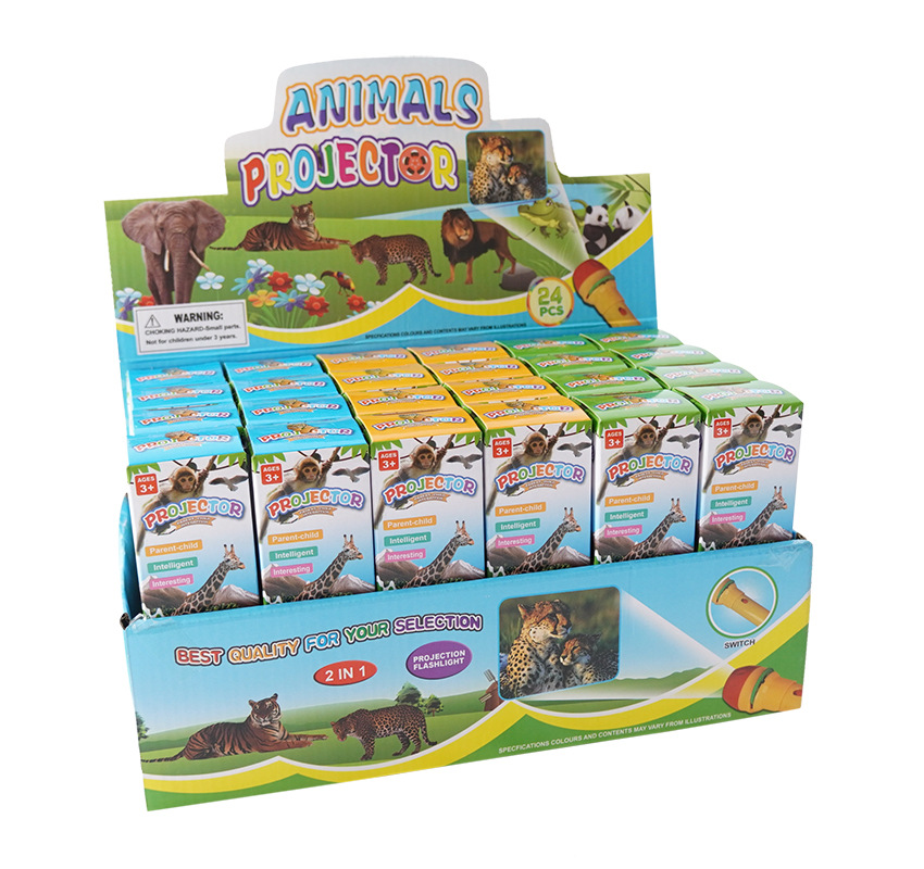 Projektor, który wyświetla obrazy zwierząt na gładkiej powierzchni w ciemności. Dzieci uczą się rozpoznawać zwierzęta i ćwiczą swoje umiejętności motoryczne podczas pracy z projektorem.
