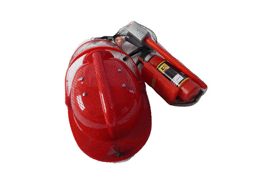 Zestaw zawiera podstawowe narzędzia prawdziwego strażaka. Kask z osłoną oczu, siekiera, telefon, gaś
