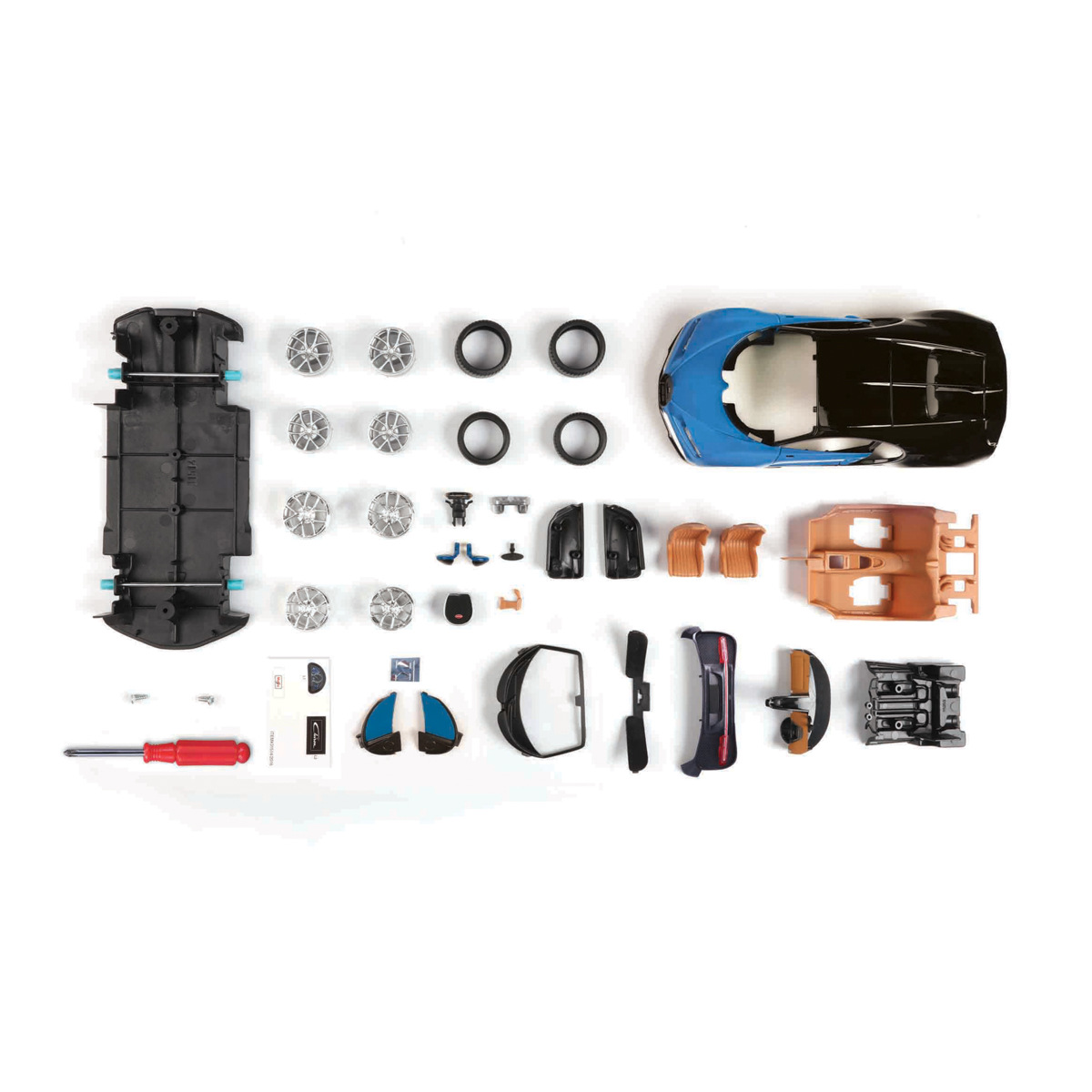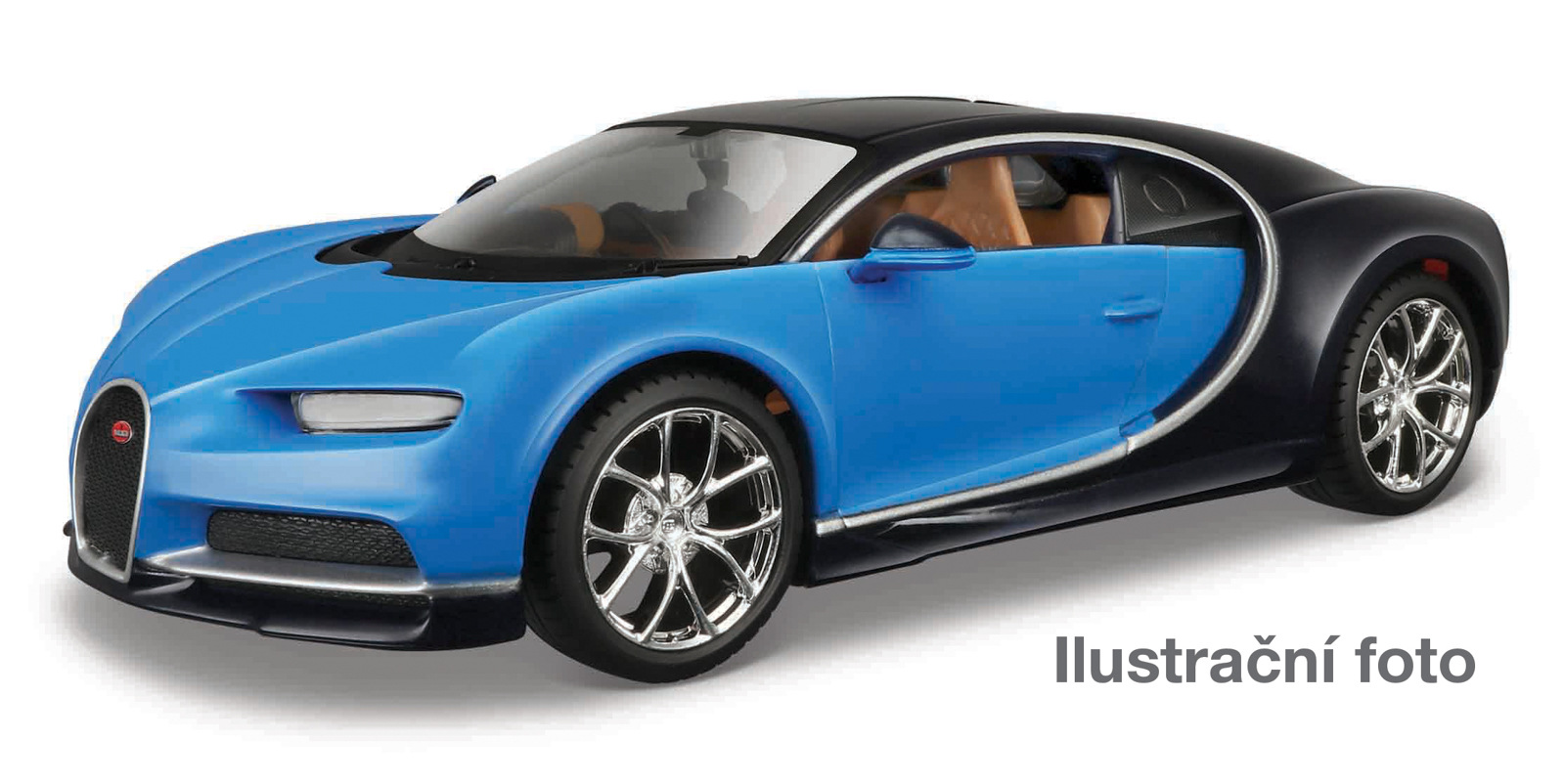 Bugatti Chiron. Model jest w wersji zestawowej, składa się z 38 elementów, jako bonus można wybrać jeden z dwóch zestawów kół, model składa się bez klejenia i malowania. Formowany wtryskowo metal z plastikowymi częściami. Wymiary: 22,9x16,8x10,2 cm. Wiek: 8+