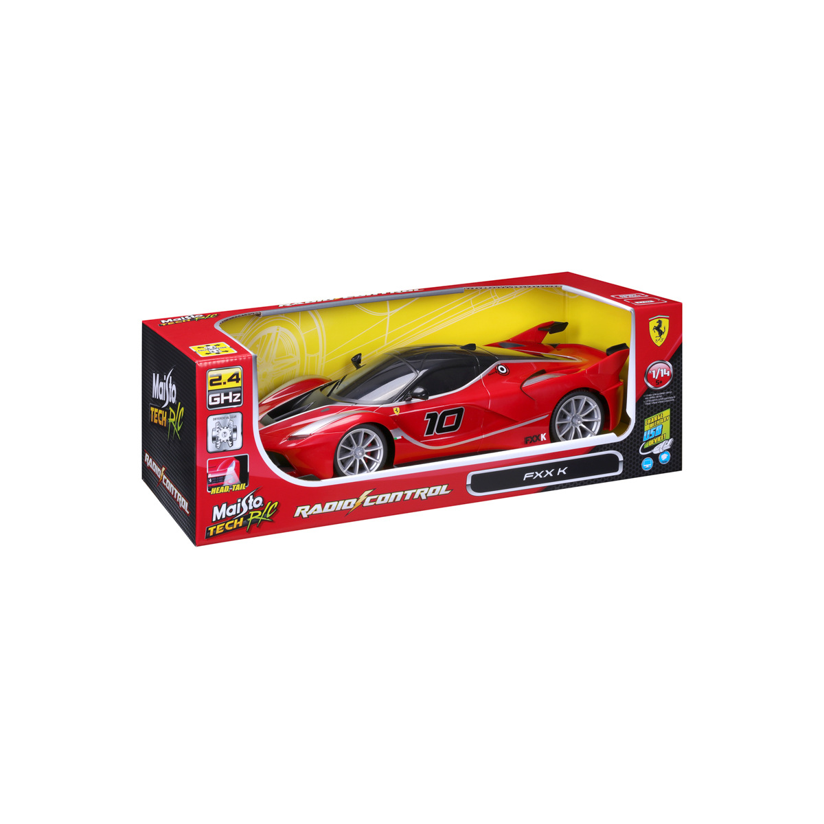 Ferrari FXX K w skali 1:14, kolor czerwony. Model marki Maisto na zdalne sterowanie. Samochód ma działające reflektory. Częstotliwość 2,4 GHz umożliwia jednoczesną jazdę aż 4 modelami RC. Samochód wykorzystuje akumulator ładowany za pomocą kabla USB (oba w zestawie). Pilot zdalnego sterowania ma zasięg do 35 metrów. Pilot używa 2x baterii AAA (w zestawie). Wymiary opakowania: 42,5x13,9x18,2 cm. Wiek 5+