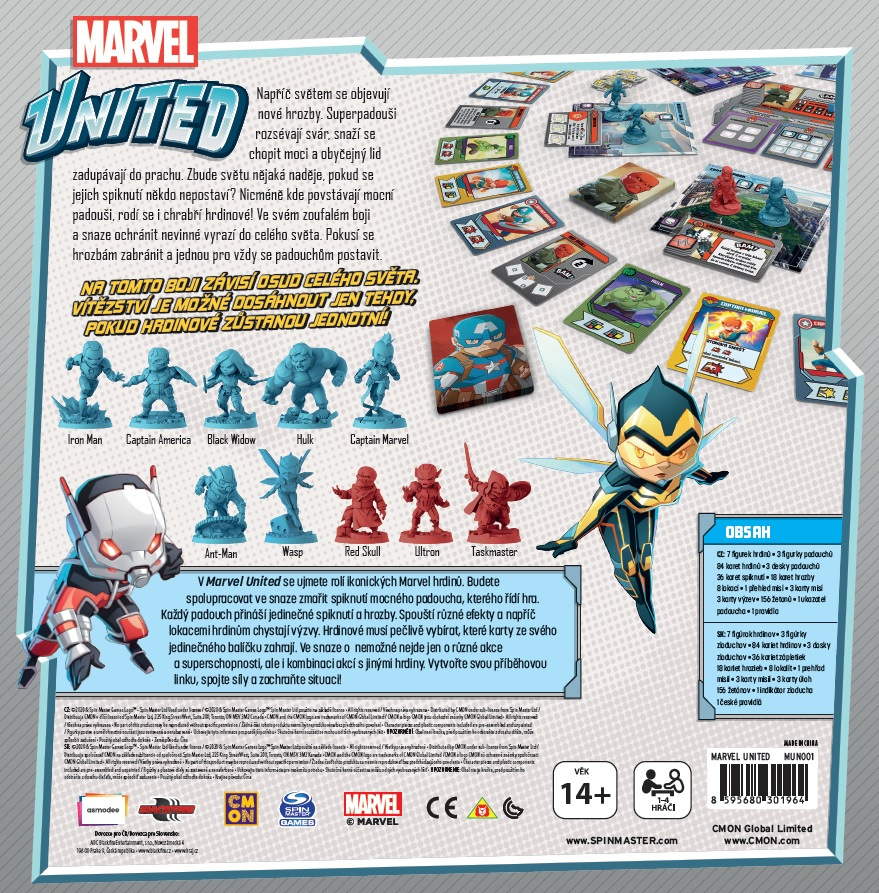 V Marvel United se ujmete rolí ikonických Marvel hrdinů. Budete spolupracovat ve snaze zmařit spiknutí mocného padoucha, kterého řídí hra. Každý padouch přináší jedinečné spiknutí a hrozby. Spouští různé efekty a napříč lokacemi hrdinům chystají výzvy. Hrdinové musí pečlivě vybírat, které karty ze svého jedinečného balíčku zahrají. Ve snaze o nemožné nejde jen o různé akce a superschopnosti, ale i kombinaci akcí s jinými hrdiny. Vytvořte svou příběhovou linku, spojte síly a zachraňte situaci!