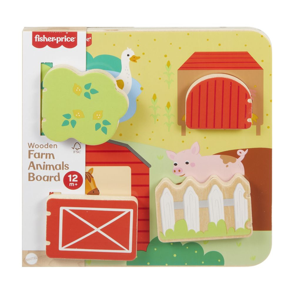 Drewniana tablica ze zwierzątkami z farmy od Fisher-Price® jest pełna zabawnych niespodzianek! Ta plansza do gry, wykonana z drewna pochodzącego z dobrze zarządzanych źródeł z certyfikatem Forest Stewardship Council (FSC C004225), zawiera 4 drzwiczki, które otwierają się i ukazują różne przyjazne zwierzęta z farmy oraz ich młode.