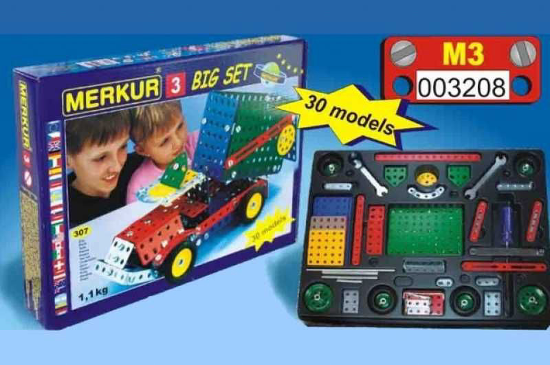 Trójwarstwowy klasyczny duży zestaw. Zestaw zawiera wszystkie części takie jak Merkur M4 plus całą masę innych części, takich jak gąsienice, duże koła, długie kąty, taśmy itp. Do zestawu dołączona jest duża instrukcja zawierająca instrukcje budowy 80 różnych modeli, takich jak koparka, koparka kołowa, ciężarówka, ciągnik gąsienicowy, dźwig itp. Zestaw zawiera 768 elementów. Nadaje się również dla dzieci, które dopiero zaczynają przygodę z Merkurym. Zmontowanymi modelami można się bawić, są bardzo wytrzymałe. Rozmiar opakowania: 36 x 27 x 8 cm. Wiek: 5+. Nieodpowiednie dla dzieci w wieku poniżej 3 lat.