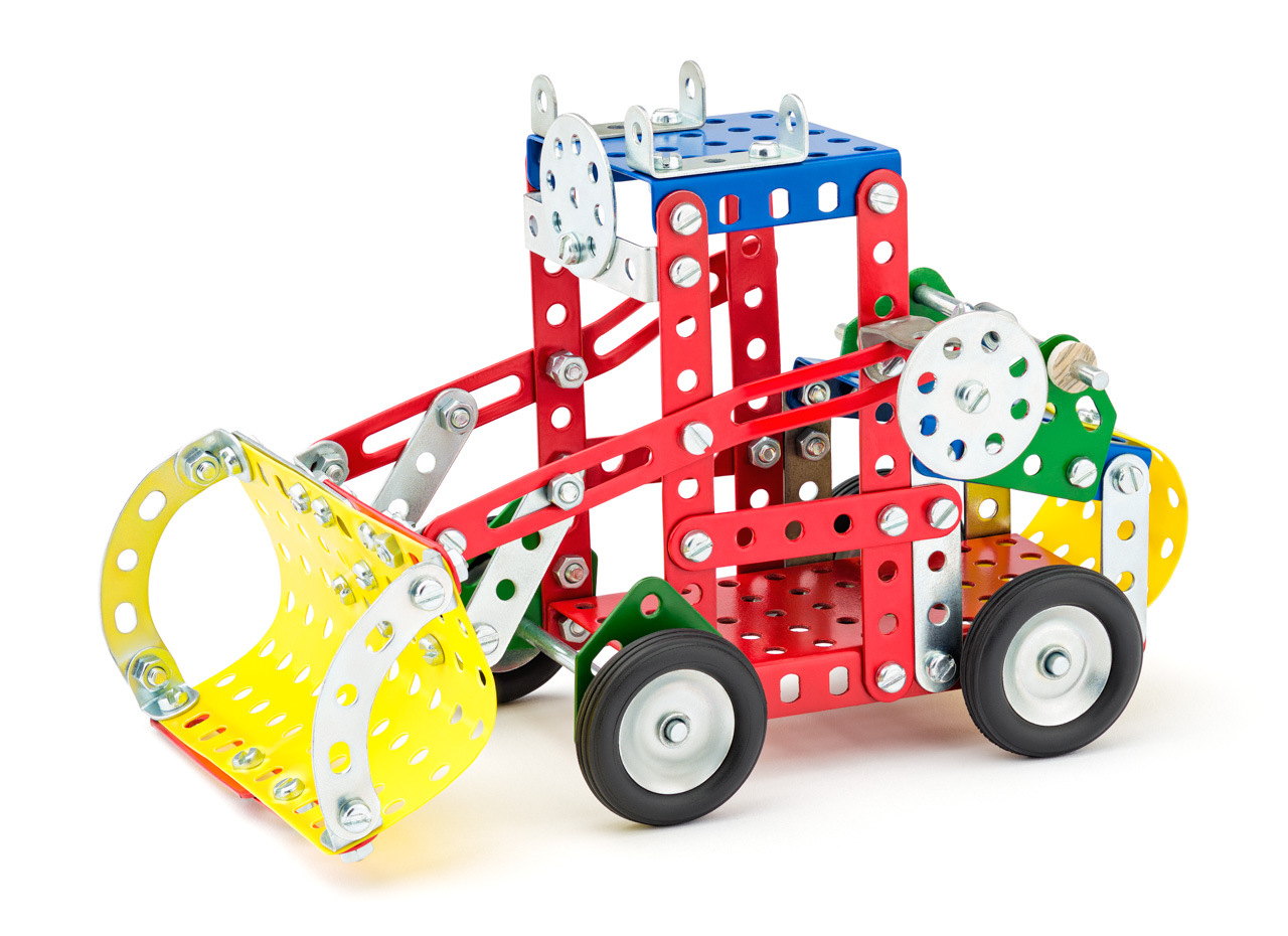 Ten zestaw Merkur może być użyty do zbudowania modelu buldożera zgodnie z instrukcją. Plastikowe części są dodawane w celu uzupełnienia przedniego ostrza w celu łatwego kształtowania. Mali inżynierowie mogą również zbudować model według własnego pomysłu, wyobraźnia nie ma granic. Zestaw zawiera 504 elementy, w tym śrubokręt i złącza śrubowe. Zmontowanym modelem można się bawić, jest bardzo wytrzymały. | Liczba elementów: 504| Wymiary zmontowanego produktu: 28,5 x 15,5x 20,5 cm szerokości | Wiek: 5+ | Nieodpowiednie dla dzieci poniżej 3 lat | Waga: 1,18 kg