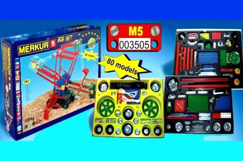Trójwarstwowy klasyczny duży zestaw. Zestaw zawiera wszystkie części takie jak Merkur M4 plus całą masę innych części, takich jak gąsienice, duże koła, długie kąty, taśmy itp. Do zestawu dołączona jest duża instrukcja zawierająca instrukcje budowy 80 różnych modeli, takich jak koparka, koparka kołowa, ciężarówka, ciągnik gąsienicowy, dźwig itp. Zestaw zawiera 768 elementów. Nadaje się również dla dzieci, które dopiero zaczynają przygodę z Merkurym. Zmontowanymi modelami można się bawić, są bardzo wytrzymałe. Rozmiar opakowania: 36 x 27 x 8 cm. Wiek: 5+. Nieodpowiednie dla dzieci w wieku poniżej 3 lat.