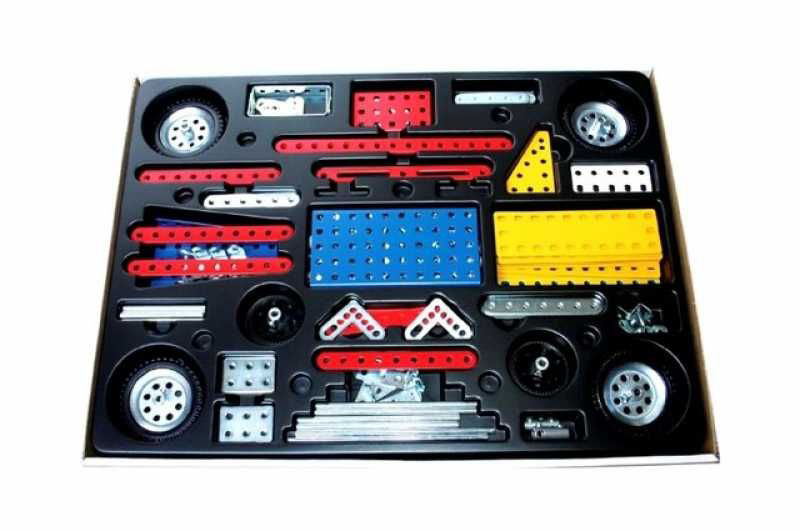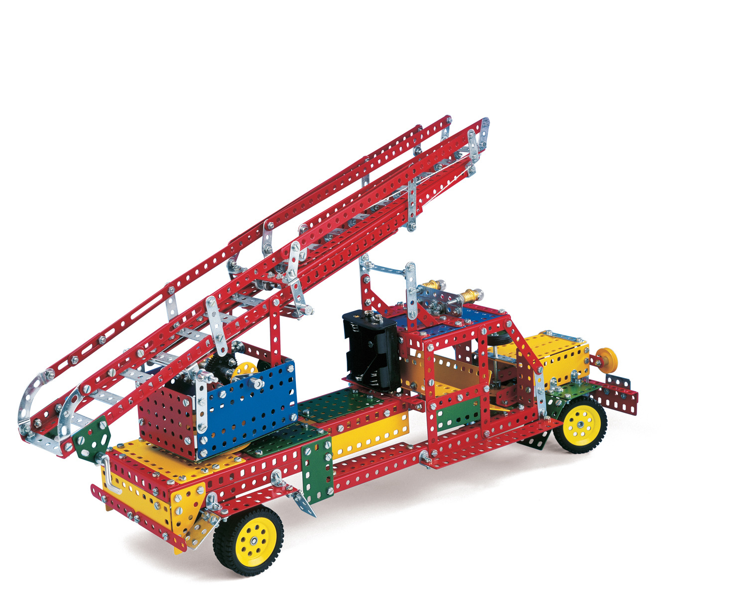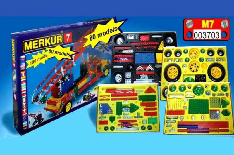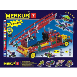 Merkur 7 to duży, czterowarstwowy, klasyczny zestaw. Zawiera podstawowy zestaw części oraz dodatkowe części do budowy dużego wozu strażackiego, dużych dźwigów i innych modeli. Zestaw zawiera dużą instrukcję z instrukcjami budowy 100 modeli - wozu strażackiego, dźwigu samochodowego itp.