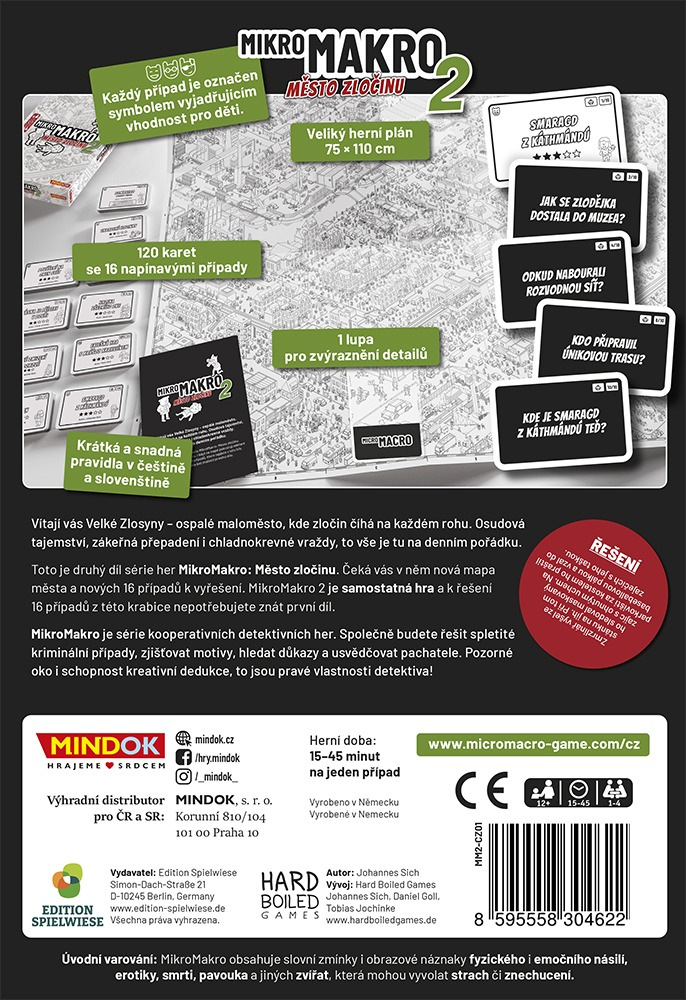 Toto je druhý díl série her MikroMakro: Město zločinu. Čeká vás v něm nová mapa města a nových 16 případů k vyřešení. MikroMakro 2 je samostatná hra a k řešení 16 případů z této krabice nepotřebujete znát první díl.