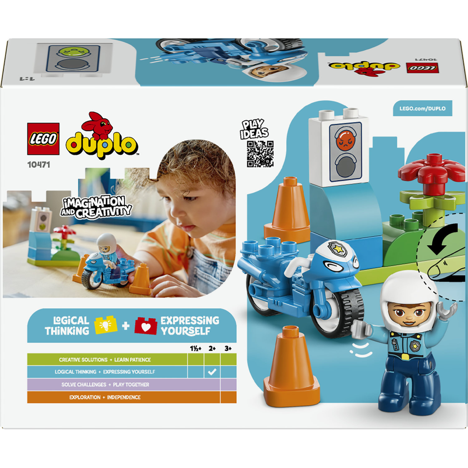 Dopřejte dětem od 2 let bleskovou zábavu se stavebnicí LEGO® DUPLO® Město Modrá policejní motorka (10471). S touto vzdělávací hračkou si malé děti budou hrát na to, že pomáhají v komunitě, a vyrazí s policistkou na hlídku na silnicích na parádní motorce LEGO DUPLO. Tato stavebnice představuje skvělý dárek k narozeninám nebo jen tak pro radost pro děti od 2 let, které milují modely vozidel. Dáreček pro malé děti obsahuje figurku policistky, kostku v podobě semaforu a kužely. Stavebnice LEGO DUPLO s velkými barevnými kostkami, zábavnými příběhy a rozmanitými postavami jsou navrženy tak, aby podněcovaly přirozenou zvědavost batolat a pomáhaly jim procházet důležitými vývojovými milníky. Děti posadí policistku LEGO DUPLO na motorku a procvičí své jemné motorické schopnosti při jízdě kolem kuželů. S hračkou v podobě semaforu můžou rodiče naučit malé účastníky silničního provozu, že červená znamená zastavit a zelená znamená start! Stavebnice obsahuje 11 dílků.