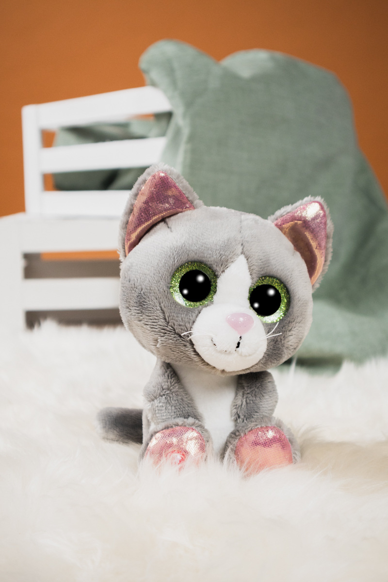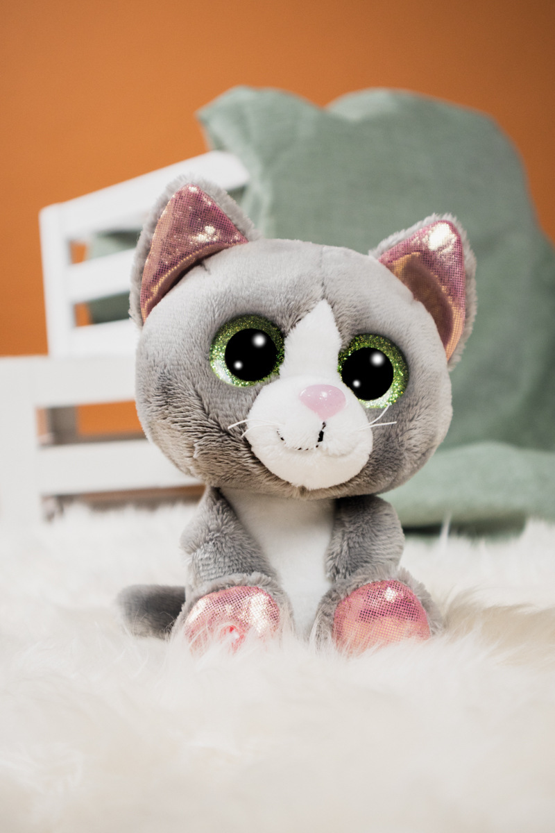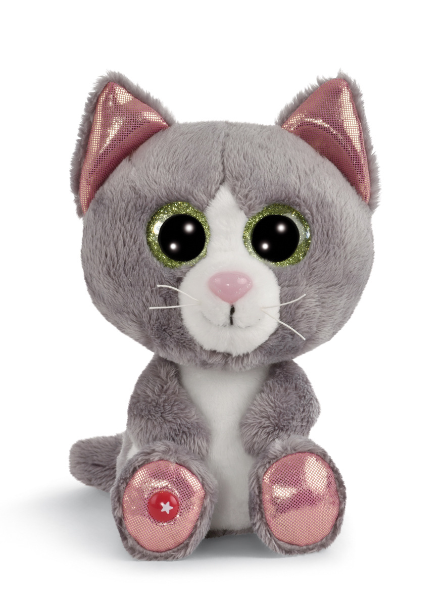 Słodki szary kot z błyszczącymi oczami i różowymi błyszczącymi uszami i łapami. Seria Nici GREEN wykorzystuje prawie wyłącznie plusz i materiały wypełniające wykonane z materiałów pochodzących z recyklingu. Wysokość: 15 cm. Wiek: 0+