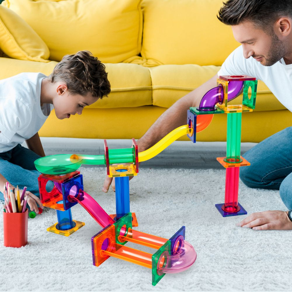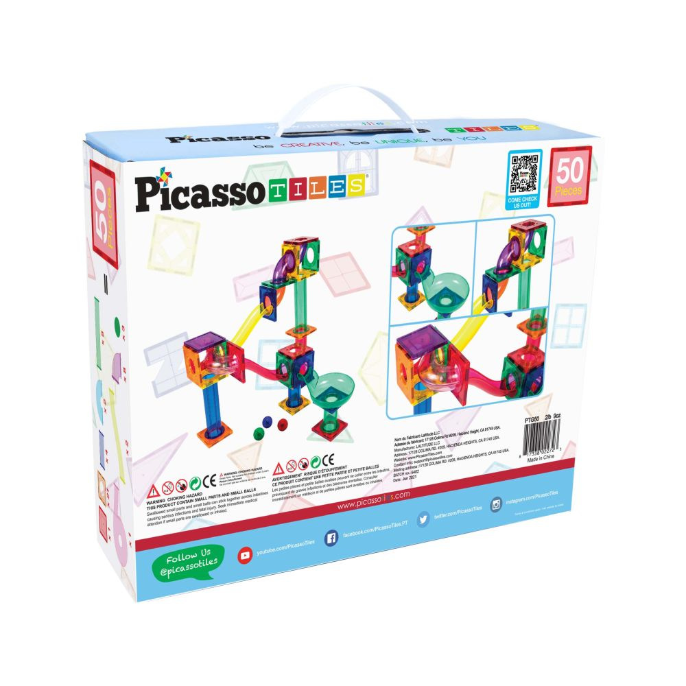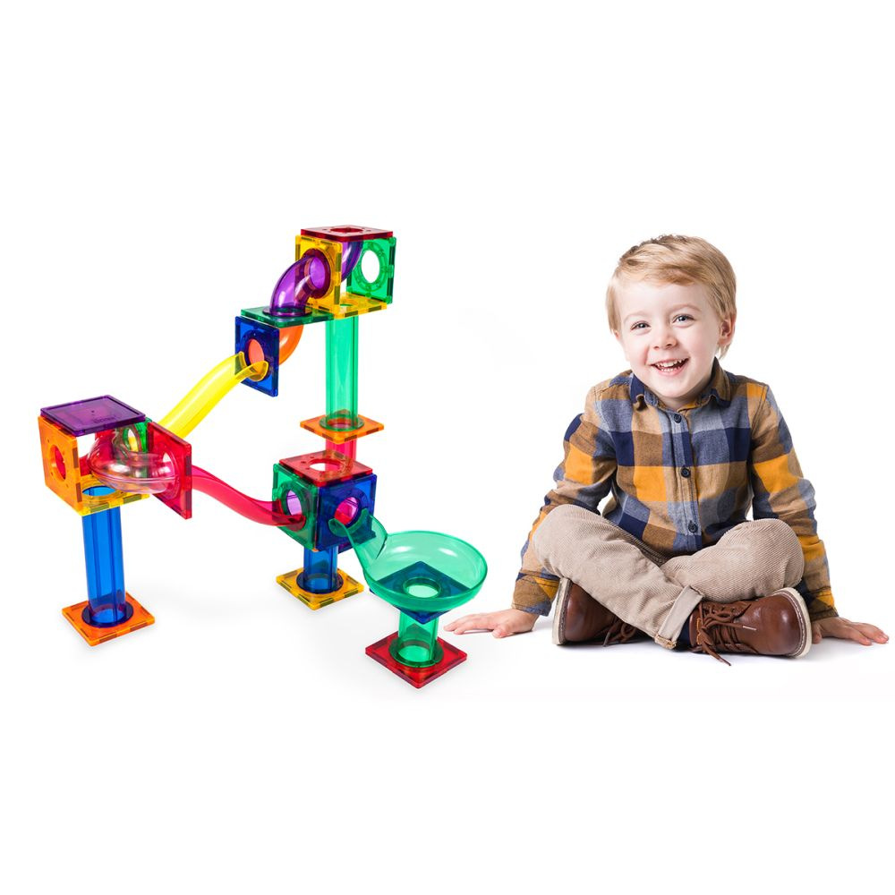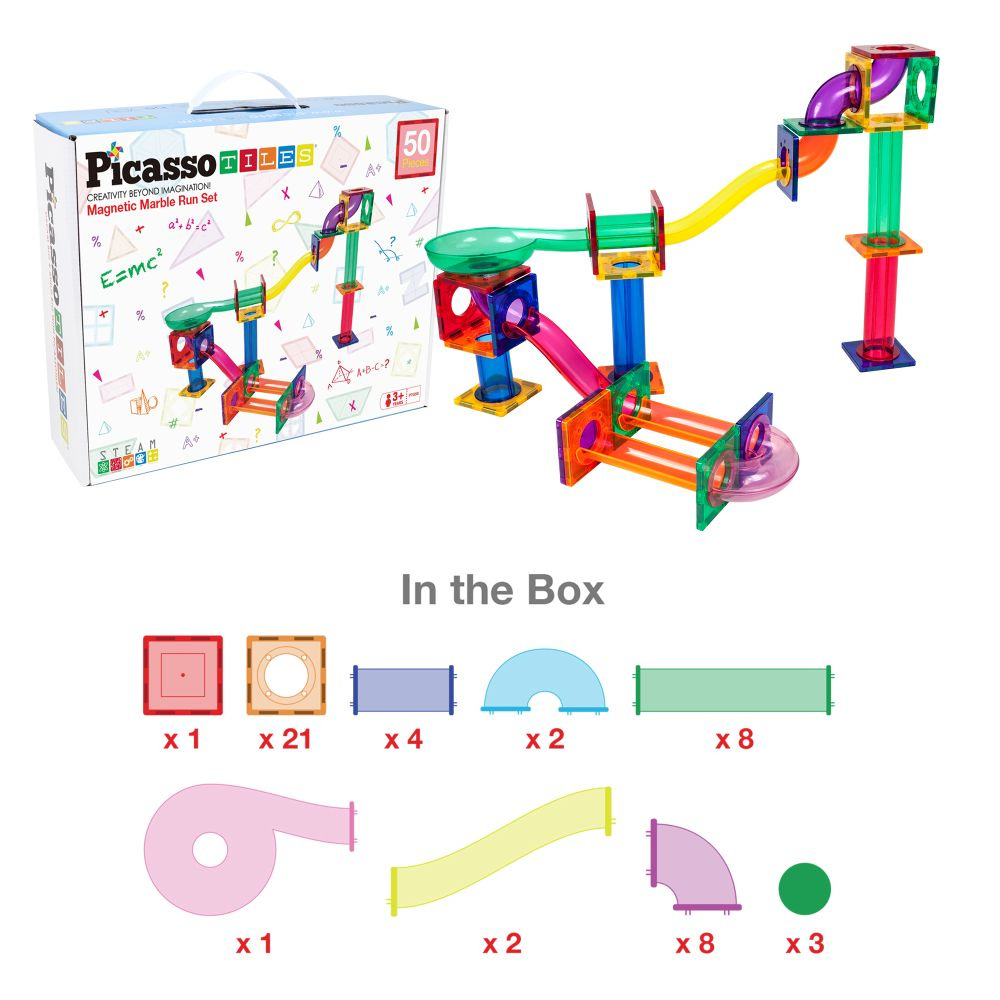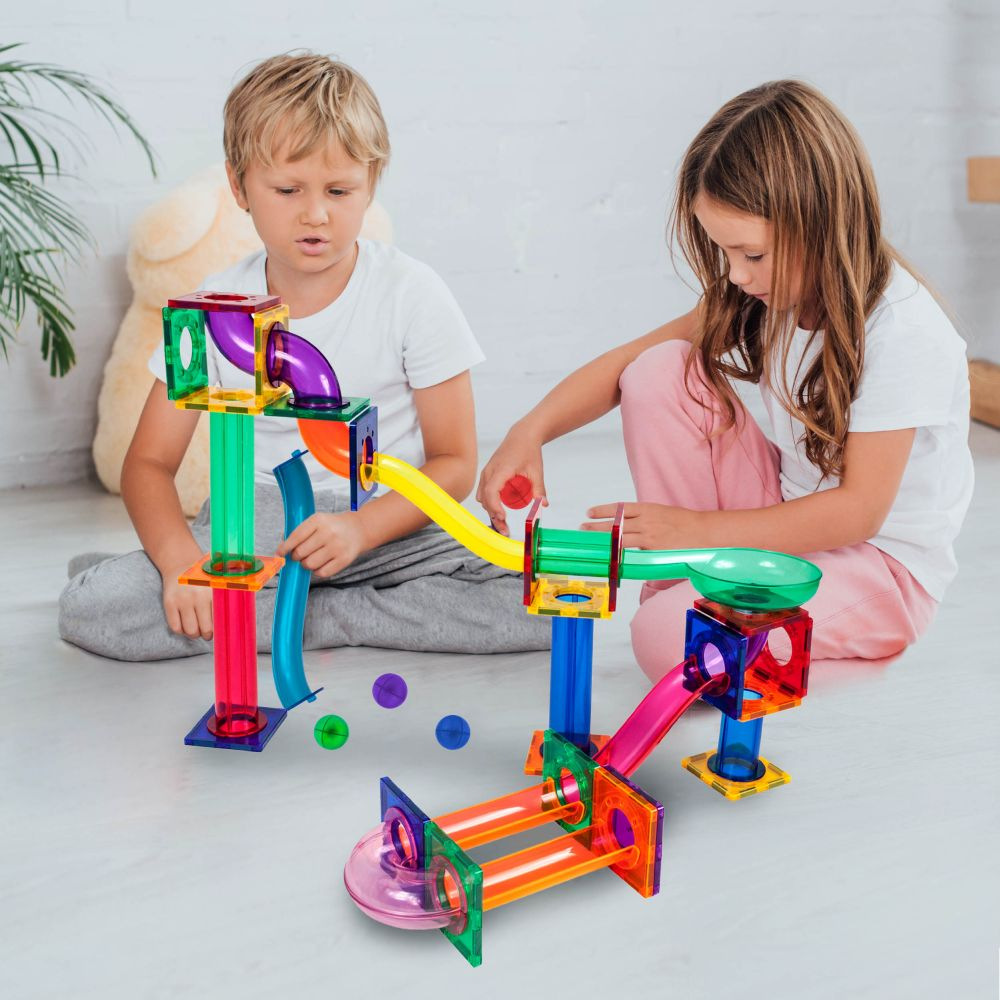 Obsahuje 50 magnetických stavebních dílků. Nabízí kuličkovou dráhu s klouby a trychtýři, kde kuličky projíždějí zatáčkami, překážkami a skluzavkami. Podporuje inženýrské dovednosti, objevování a kreativní experimentování. Poskytuje zábavu i vzdělávací STEM zkušenost.