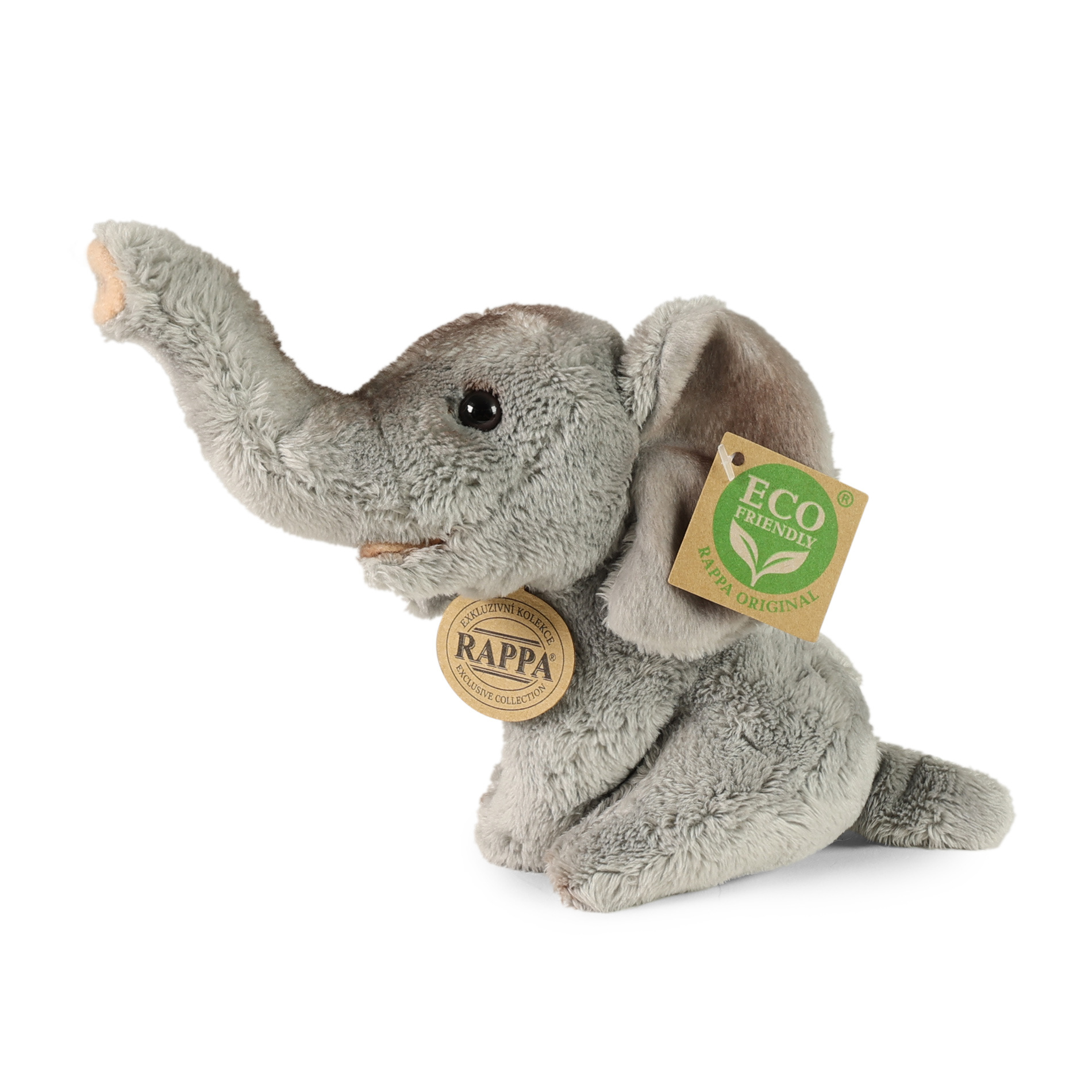 Plyšový slon měří 15 cm a díky těm nejkvalitnějším materiálům se řadí do Exkluzivní kolekce plyšových hraček značky Rappa. Díky ručnímu zpracování každého kusu navíc vypadá jako živý. Proč označení ECO-FRIENDLY? Rappa si je vědoma všech dopadů na životního prostředí, zaměřuje se na udržitelnost a omezení používání plastů na minimum. Proto je výplň hraček vyrobena z recyklovaných materiálů, zejména PET lahví. Ta je však zcela nezávadná a vhodná i pro děti od narození. FUN FACT: Věděli jste, že sloni mají neuvěřitelnou paměť a dokážou si pamatovat vodní zdroje a cesty k nim i po mnoha letech?