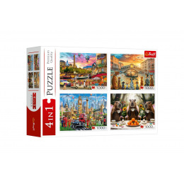 Puzzle obsahující čtyři různé puzzle s 1000 dílky. Rozměr jednoho složeného obrázku: 683x480 mm