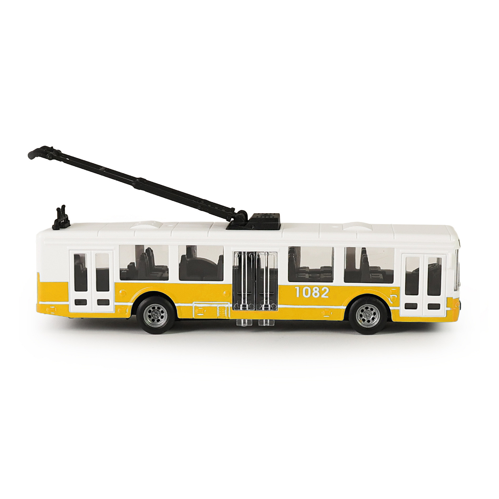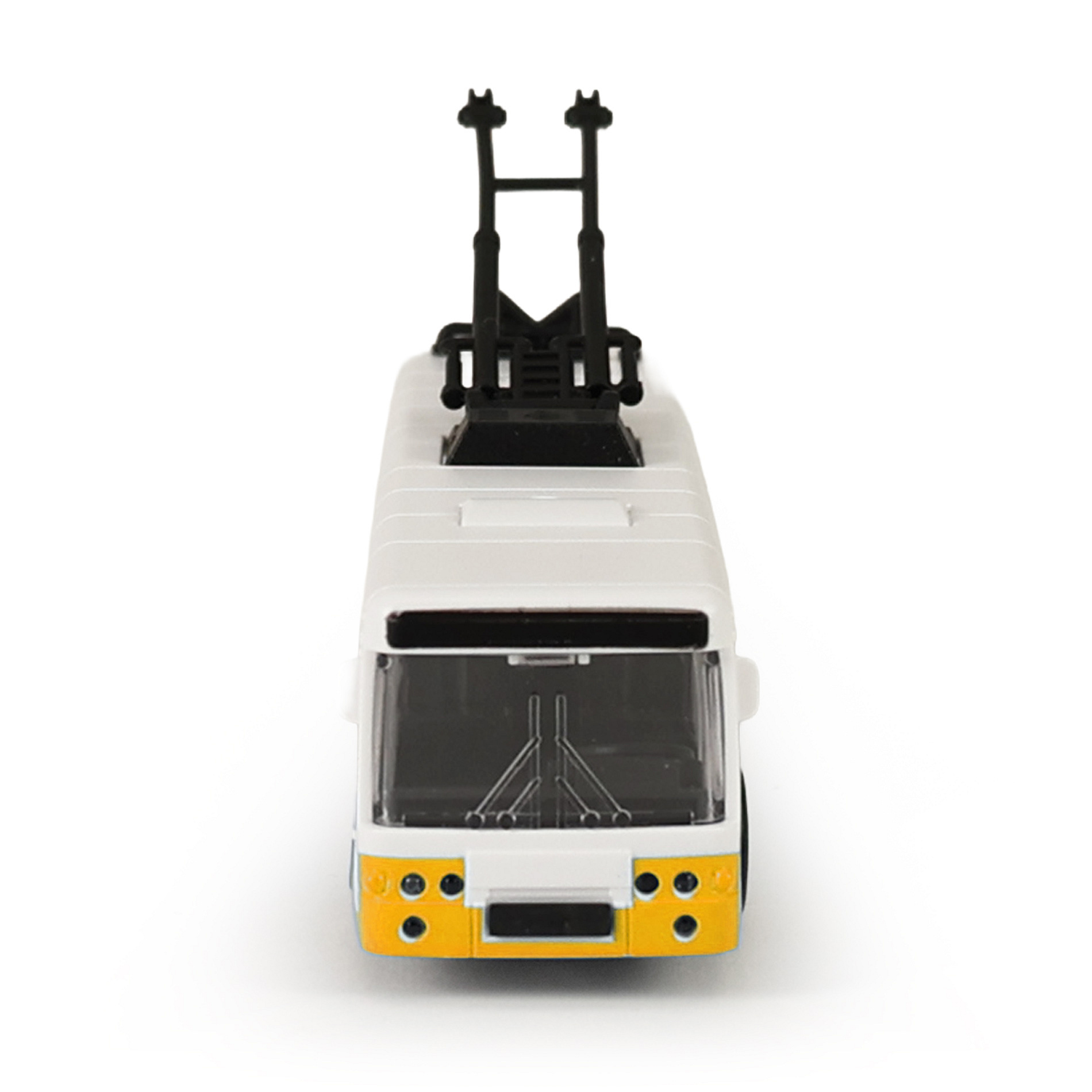 Plastový trolejbus MHD o délce cca 16 cm potěší všechny malé milovníky dopravních prostředků. Díky setrvačníkovému pohonu stačí trolejbus jemně popostrčit a sám se rozjede, což přináší spoustu zábavy při hraní. Trolejbus má mechanicky otevíratelné prostřední dveře, které umožňují ještě více vtáhnout děti do hry a vytvářet vlastní příběhy z městského provozu.