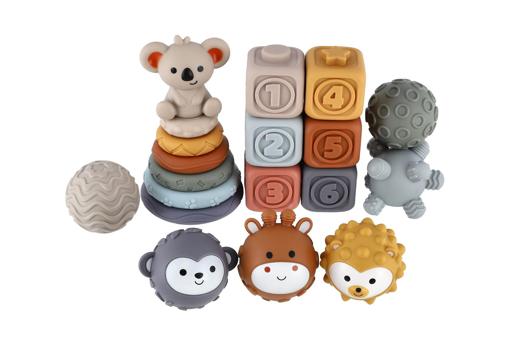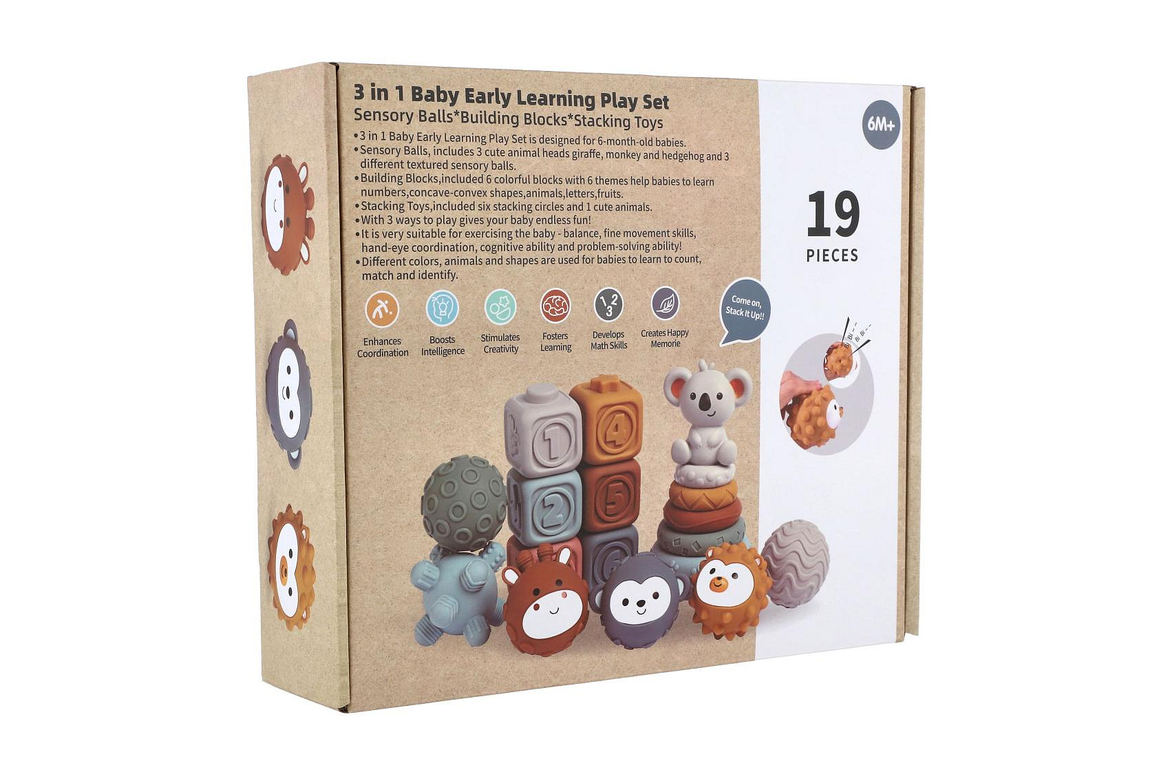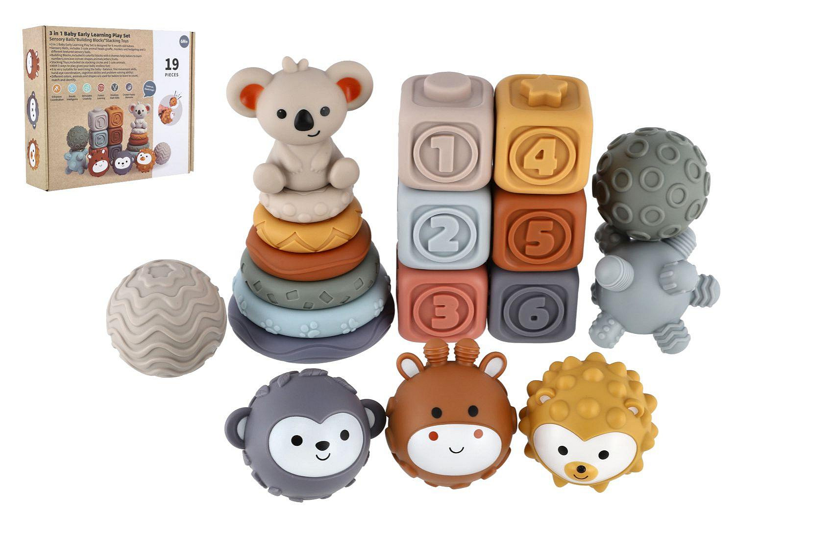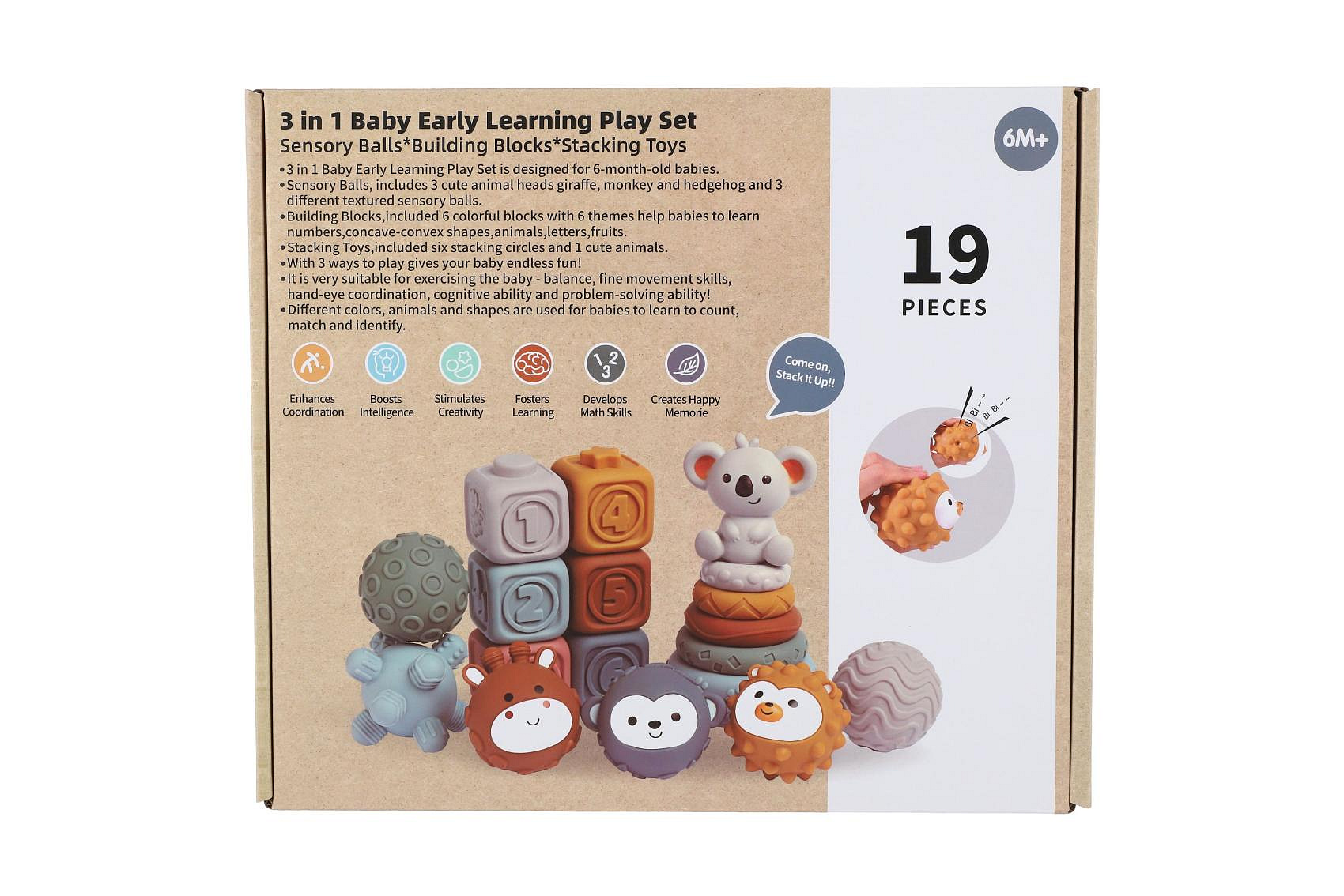 Komplexní sada pro nejmenší děti, která kombinuje stohovací pyramidu, kostky a smyslové míčky. Hračka podporuje rozvoj jemné motoriky, koordinace a smyslového vnímání již od útlého věku. Díky různým tvarům, barvám a texturám si děti procvičují hmat, učí se rozpoznávat velikosti i čísla a rozvíjejí svou kreativitu při skládání.