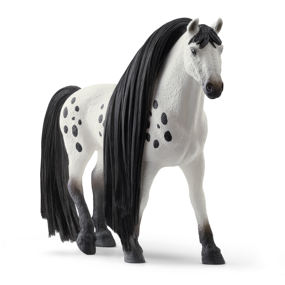 Czyż nie wygląda pięknie? Pokazowy ogier Knabstrup przyciąga uwagę swoją pięknie nakrapianą sierścią. Ale to nie wszystko. Jego ogon i grzywa są niezwykle długie i bujne. Na szczęście zawsze ma przy sobie grzebień, którym może rozczesać swoją długą grzywę, by lśniła jak jedwab. Co powinien dziś zrobić ze swoją grzywą? Co powiesz na misternie zaplecioną fryzurę lub po prostu kilka prostych warkoczy? Tak czy inaczej, kilka koralików w grzywie lub kokardzie nigdy się nie zmarnuje. Wymiary: 19x15x6cm. Odpowiedni dla dzieci w wieku od 3 lat.