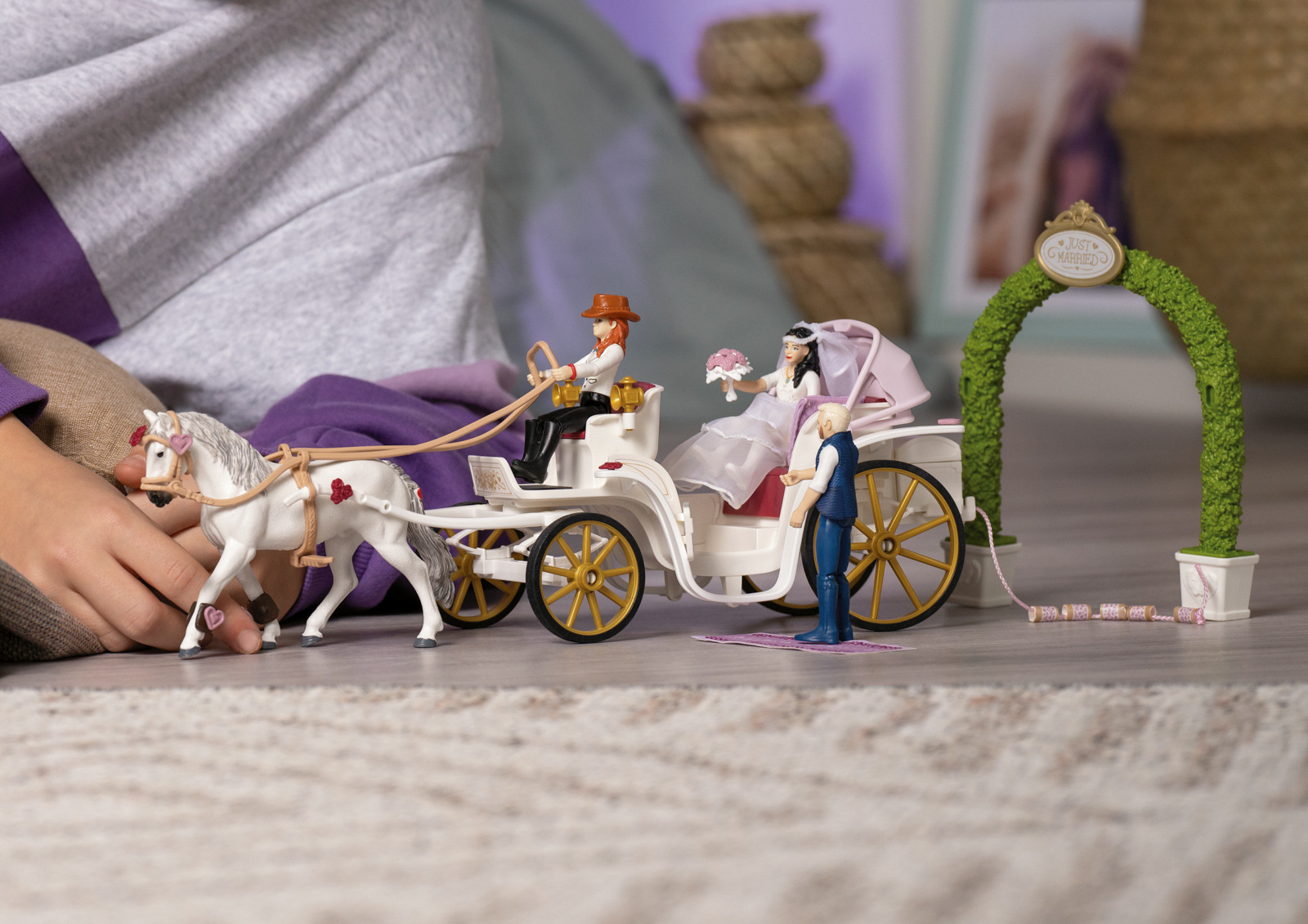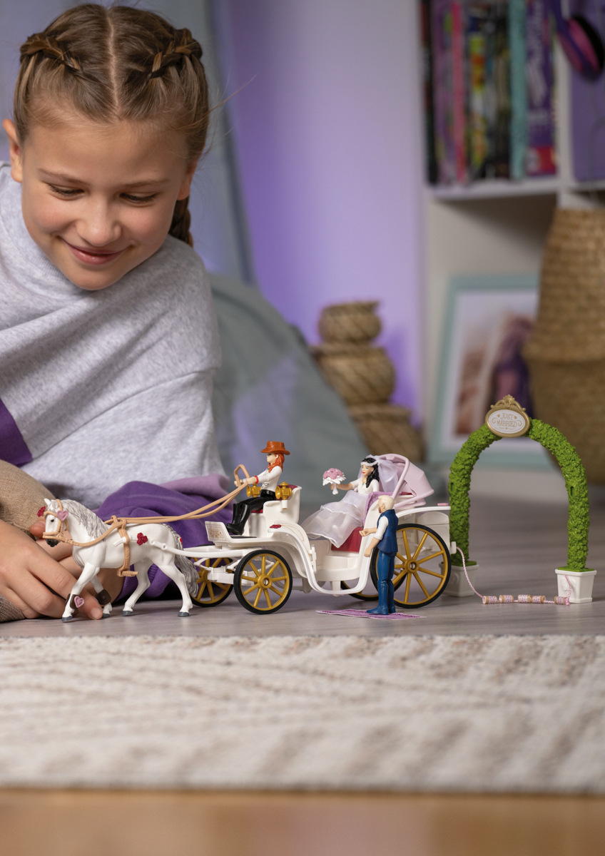 Emily wygląda uroczo w swojej sukni ślubnej. Pan młody, Toby, również się przebrał. Razem wsiadają do ślubnego powozu, do którego przymocowane są puste, grzechoczące puszki. Hanna udekorowała lipicana i powóz, aby wszystko wyglądało świątecznie. Koń ma na sobie uprząż z serduszkami, a uzda jest również ozdobiona serduszkami. Goście weselni rozgoszczą się w powozie na poduszkach w kształcie serca i wzniosą toast szampanem. Co to jest? Pod siedzeniem znajduje się tajna skrytka! Są tam ukryte jabłka na później, aby lipicaner mógł otrzymać nagrodę za swoją ciężką pracę. Opakowanie: 28x23x11cm. Wiek: 3+