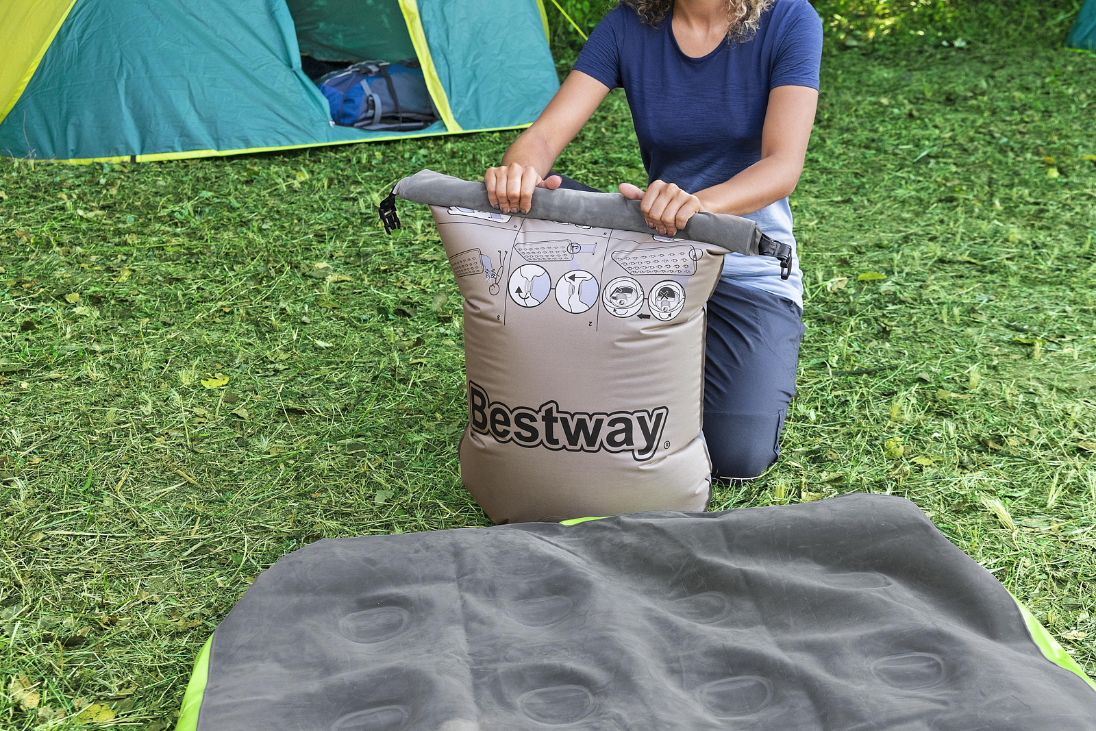 Pohodlnou nafukovací matraci Bestway ROLL and RELAX, pro jednu osobu, lze nafouknout do výšky 22 cm. Matraci nafouknete snadno do 1 minuty pomocí polštáře/vaku, který je součástí balení (stačí spojit a 6 x ručně stlačit vak). Anatomické tvarování zajišťuje maximální pohodlí. Matrace je vyrobena z kvalitních a odolných materiálů. Součástí matrace je ventil pro rychlé vypouštění. Matrace je vhodná pro vnitřní i venkovní použití. Obsahuje: 1 nafukovací matraci, 1 polštář (slouží i jako voděodolný vak na matraci a vak k nafouknutí matrace), 1 opravná sada. Rozměr: 188 x 99 x 22 cm. Rozměr balení: 54,5 x 15,5 x 15,5 cm. Počet osob: 1