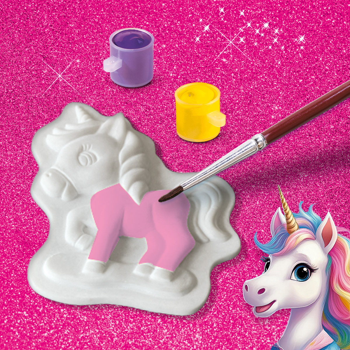 Bądź kreatywny podczas odlewania i malowania – małe jednorożce. Stwórz 10 uroczych figurek jednorożców dzięki temu zabawnemu zestawowi do majsterkowania. W zestawie znajduje się gips i forma odlewnicza umożliwiające łatwe tworzenie figurek jednorożców. Udekoruj odlewane figurki żywymi farbami plakatowymi lub wymieszaj kolory z delikatnymi pastelowymi odcieniami. Magiczny efekt można uzyskać stosując złoty i srebrny klej brokatowy. Idealne dla dzieci i dorosłych, którzy kochają malowanie, tworzenie i jednorożce. Zawartość zestawu: Forma odlewnicza do figurek jednorożców, gips 300 g, drewniana szpatułka, 6 odcieni farby plakatowej, klej z brokatem złotym, klej z brokatem srebrnym, pędzelek i instrukcja. Wymiary opakowania: 20 x 30 x 4 cm. Nieodpowiednie dla dzieci poniżej 3 lat. Wiek: 5+