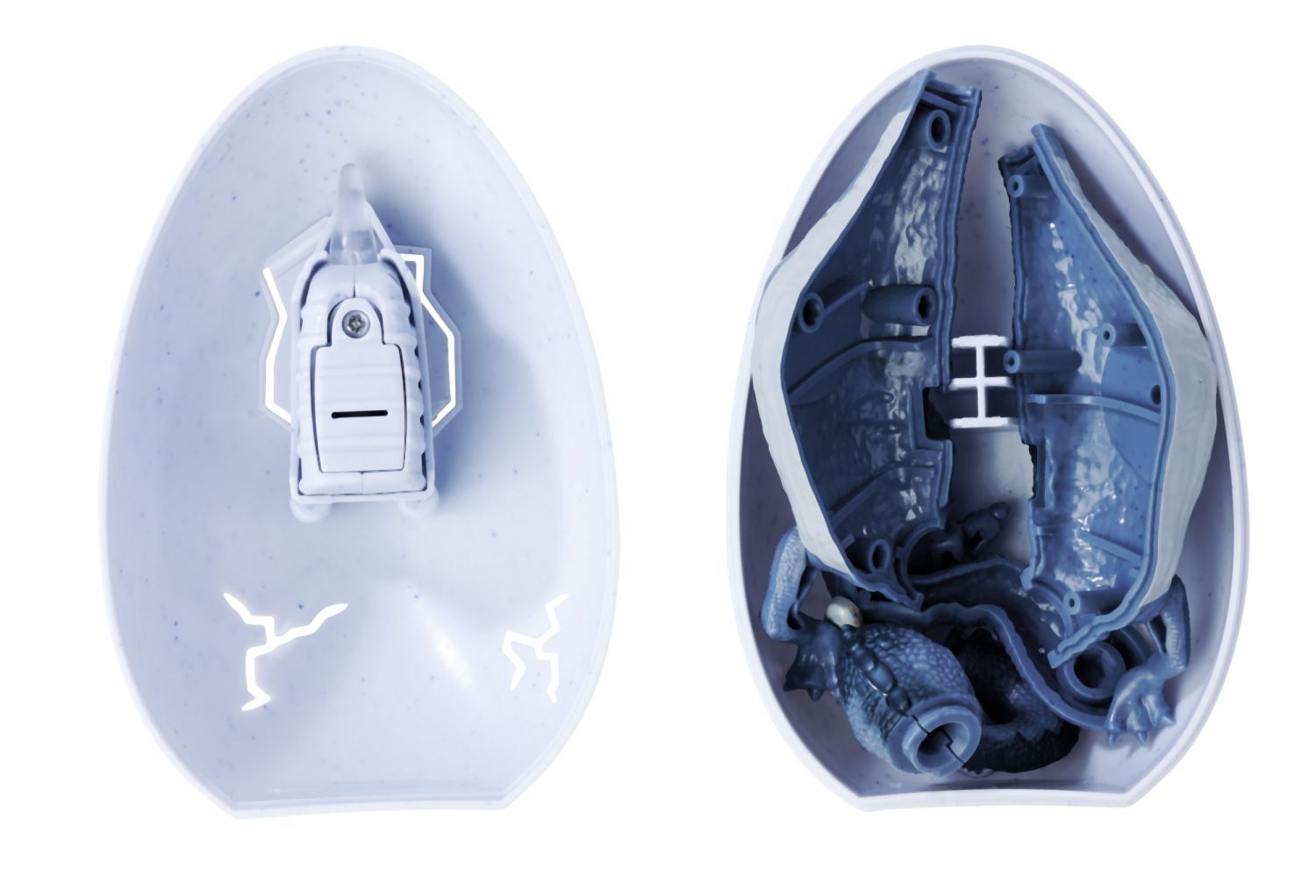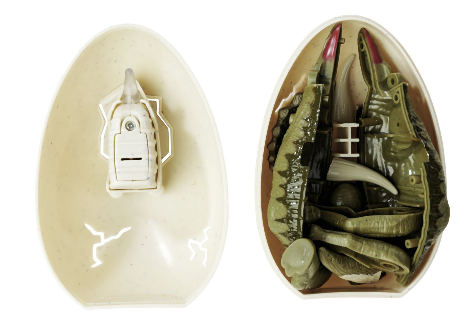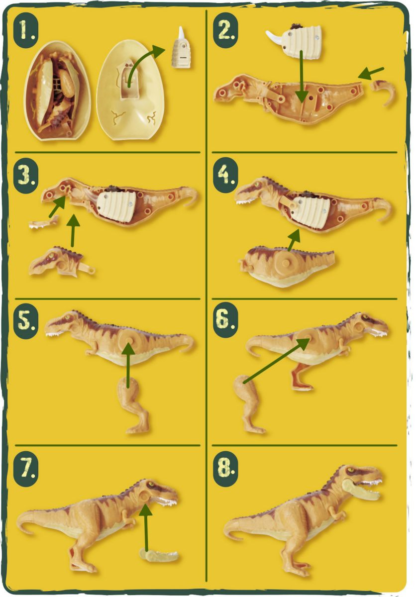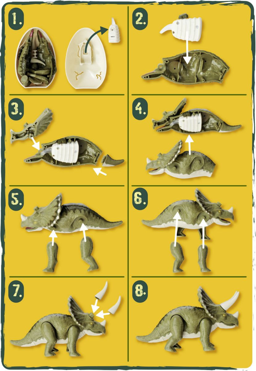 V každém vejci je schována figurka dinosaura o velikosti 14 cm, skládačka kostry dinosaura a návod. Dinosaurus svítí a vydává zvuky, 3 druhy - T-Rex, Velociraptor, Triceratops.