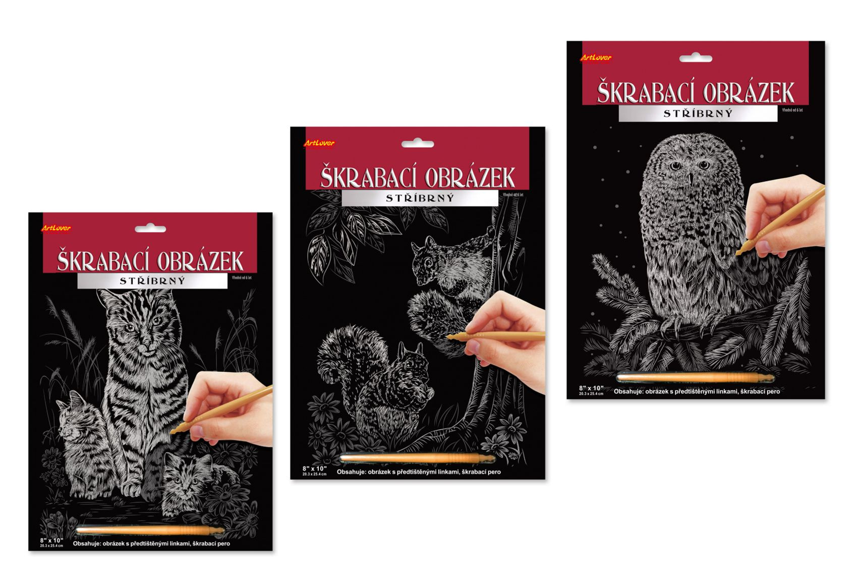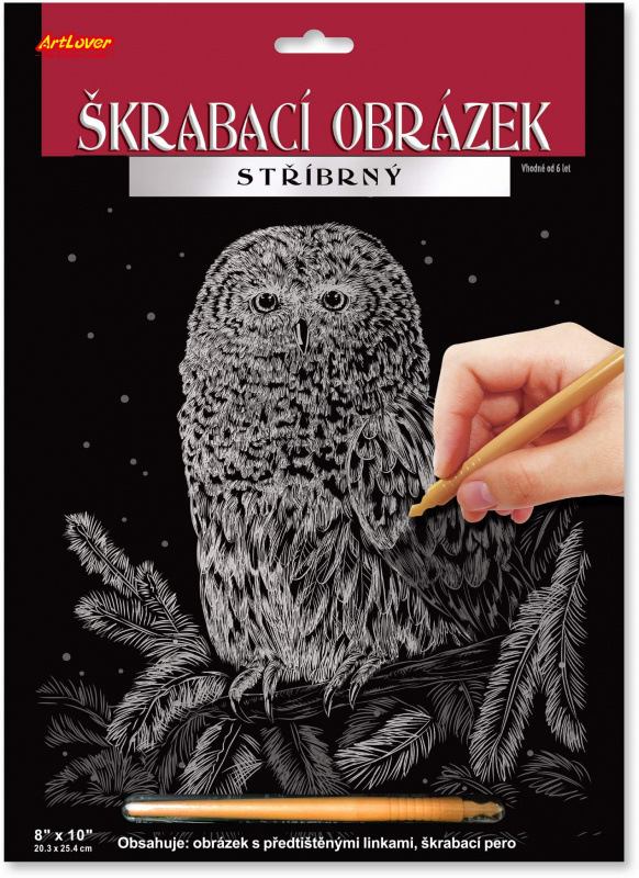 Sada obsahuje obrázek natištěný na černém kartonu a umělohmotné škrabací pero. Seškrabte předtištěné linky a objevíte obrázek, který se hezky leskne z různých úhlů pohledu. Rozměr obrázku: A4 20 x 25 cm Rozměr balení: 23 x 32 cm Vhodné od 6 let