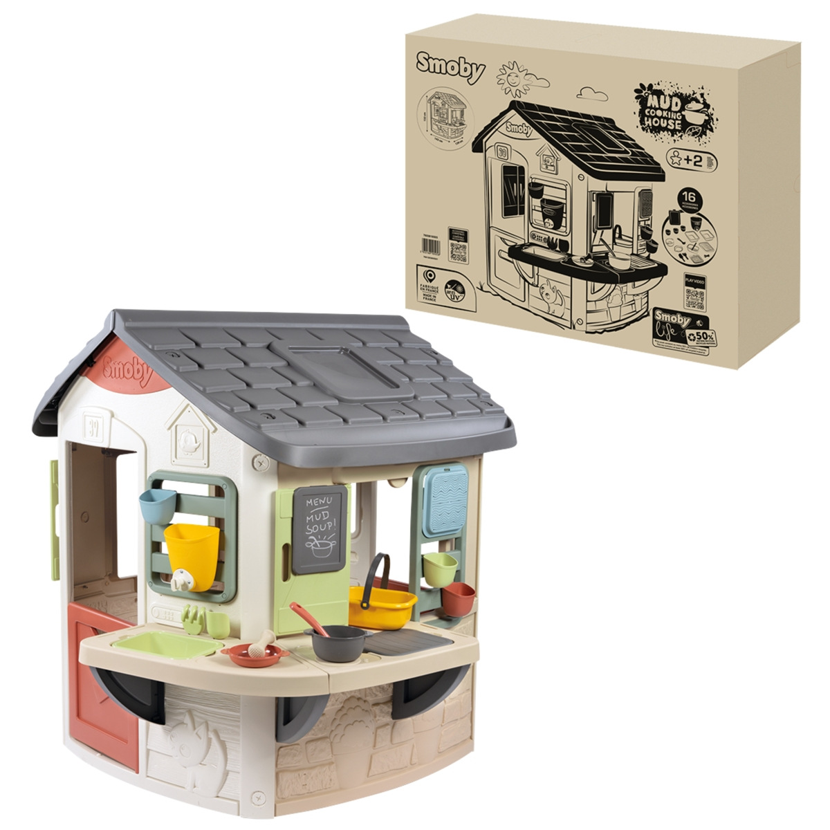 Stabilní, prostorný domeček Smoby Life Mud Cooking rozšiřitelný. Domeček má 2 dveře, 2 okna s okenicemi a speciální venkovní prostor pro hrátky s vodou a blátem. Okno s výhledem na pracovní plochu může sloužit také jako výdejní okénko. Součástí balení je 16 doplňků: košík, síto, hrnec s poklicí, naběračka, 1l nádrž na vodu s kohoutkem, lopatka a hrabičky, kreslící tabulka a mnoho dalšího. Domeček umožňuje zavěšení veškerého příslušenství, abyste ho měli po ruce. Domeček je vyroben z vysoce kvalitního plastu odolného vůči UV záření a je zvláště odolný vůči povětrnostním vlivům a vyblednutí. Tento produkt obsahuje nejméně 50 % recyklovaného materiálu. Rozměry produktu (DxŠxV): 143,9 x 139,6 x 132,1 cm. Vyrobeno ve Francii. Vhodné pro děti od 2 let.