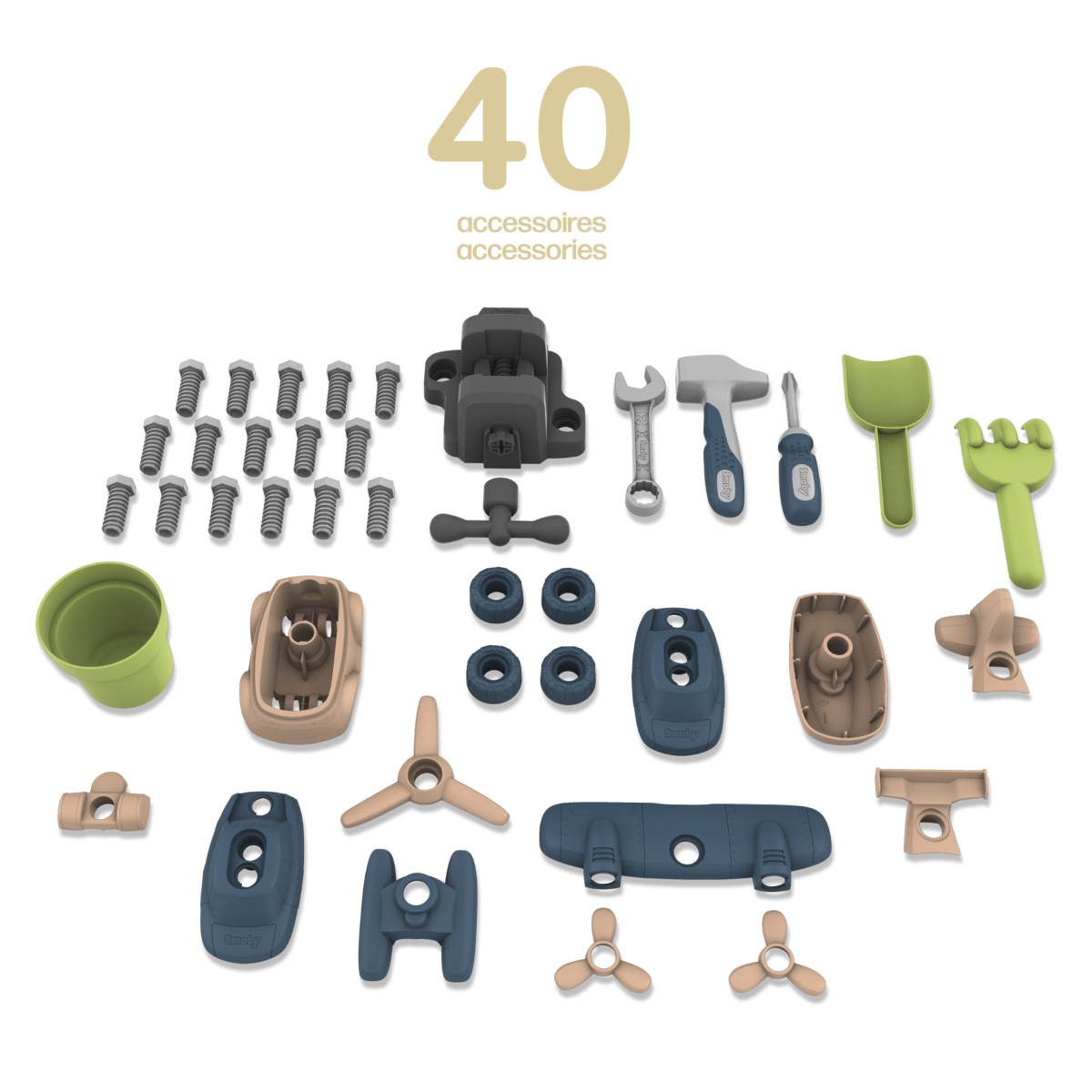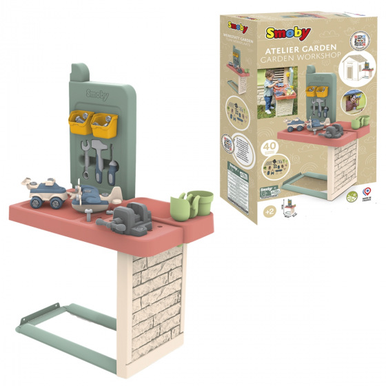 Dílna pro kutily jako doplněk k domečkům Smoby Life. Dílna se připevňuje k vnější stěně domečku, dílenský stůl má velkou pracovní plochu a stěnu s boxy pro uložení příslušenství. Součástí balení je 39 doplňků pro rozšíření herních možností: 1 šroubovák, 1 kladivo, 1 otevřený klíč, 1 svěrák, spojovací materiál, 2 vozidla (auto a vrtulník) k sestavení. Pracovní deska má otvory pro trénování zatloukání hřebíků. Dílna je vyrobena z vysoce kvalitního plastu odolného vůči UV záření a je zvláště odolný vůči povětrnostním vlivům a vyblednutí. Tento výrobek obsahuje minimálně 70 % recyklovaného materiálu. Rozměry produktu (DxŠxV): 60 x 37 x 93 cm. Vyroben ve Francii. Vhodné pro děti od 2 let.