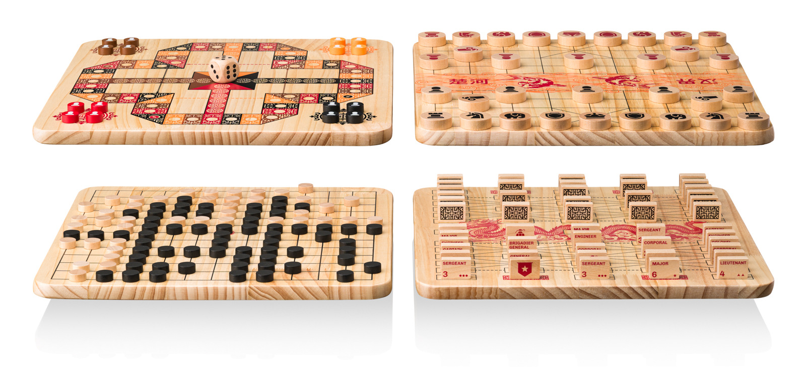 Zestaw gier dla 2-4 graczy.a. Szachownica: Szachownica 3D Wygrywa ten, kto połączy 4 figury w jedną linię (pionową, poziomą, ukośną, krzyżową na wielu poziomach). W momencie, gdy wszystkie kamienie zostaną wykorzystane, a linia nadal nie zostanie utworzona, gracze mogą wziąć kamienie znajdujące się już na planszy i przenieść je na dowolną pozycję. Jeśli w grze bierze udział tylko 2 graczy, muszą oni połączyć nie 4, ale 5 kamieni w jednej linii. królowa: Celem gry jest zbicie wszystkich pionów przeciwnika. W warcabach występują dwa rodzaje pionów: kamienie i królowe (2 kamienie ułożone jeden na drugim). Kamień staje się królową, jeśli dotrze przez całe pole do ostatniego rzędu. Na początku gry każdy gracz ma 12 kamieni w pozycji pokazanej na obrazku. Gra rozpoczyna się od zagrania przez gracza białych kamieni, a następnie gracze zmieniają się. Wszystkie ruchy są wykonywane tylko do przodu po przekątnej do wolnego sąsiedniego pola. Królowa może wejść na dowolne pole po przekątnej w dowolnym kierunku. Branie lub przeskakiwanie: kamień bierze pion przeciwnika, jeśli znajduje się przed nim w kierunku