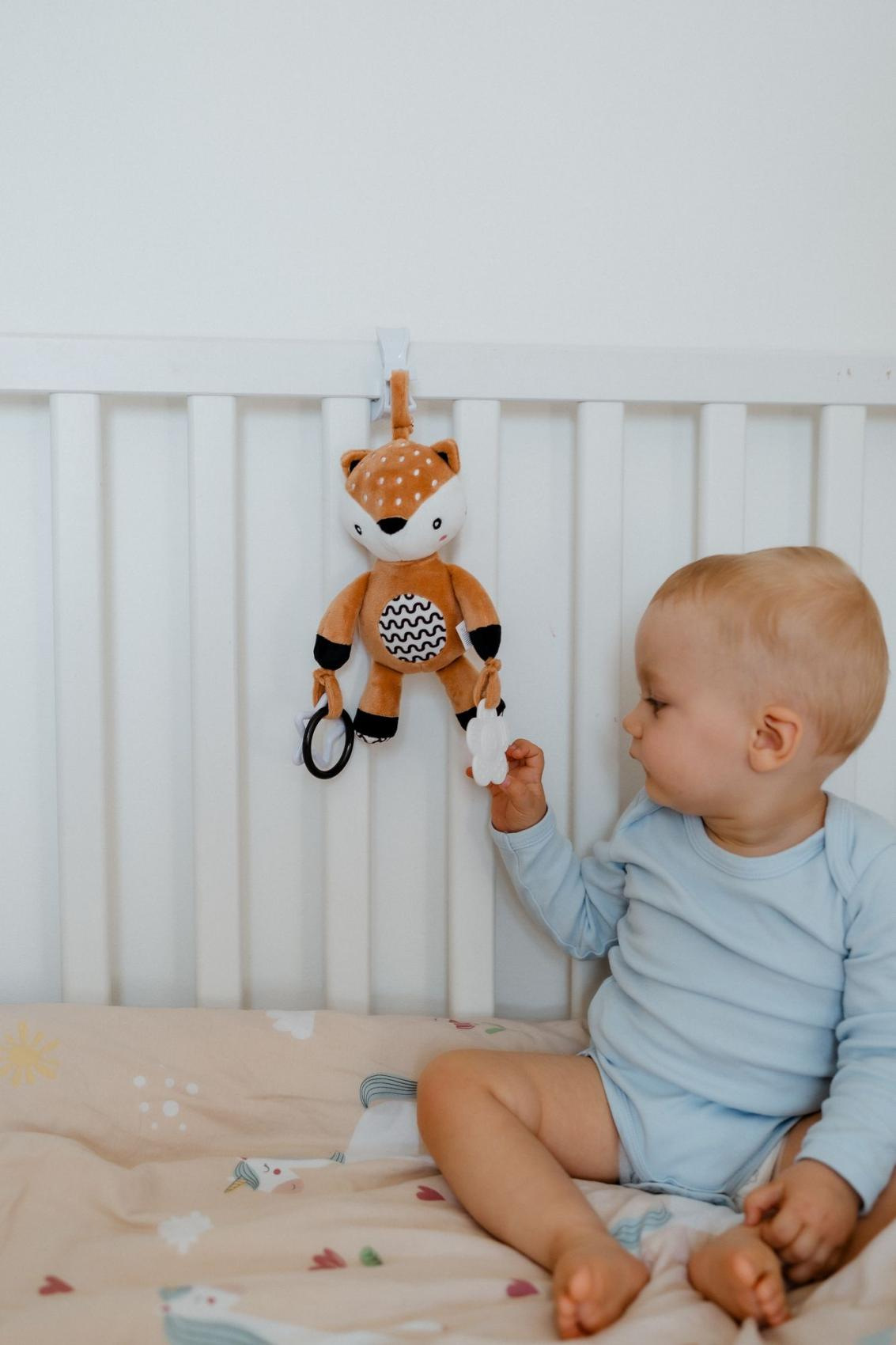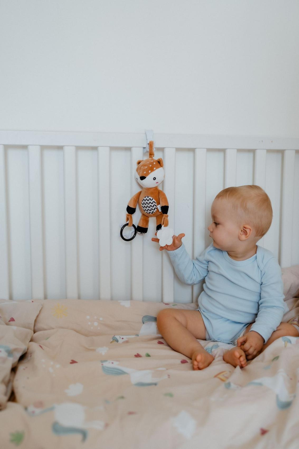 Roztomilý plyšový srneček je ideální hračka pro miminka již od narození. Díky praktickému závěsnému klipu jej snadno připevníte na kočárek, postýlku, autosedačku nebo hrací hrazdičku. Miminko tak může mít svého mazlivého kamaráda pokaždé u sebe – doma i na cestách. Srneček je vyroben z měkkého a příjemného plyšového materiálu, který láká k doteku a mazlení. Uvnitř tělíčka má jemné chrastítko, které podporuje sluchové vnímání. Na koncích ručiček jsou umístěny bezpečné plastové tvary (hvězdička a kytička), které rozvíjejí hmat, jemnou motoriku a mohou posloužit i jako hračka na žužlání. Hračka je certifikována v ČR, což garantuje splnění přísných bezpečnostních standardů pro nejmenší děti.