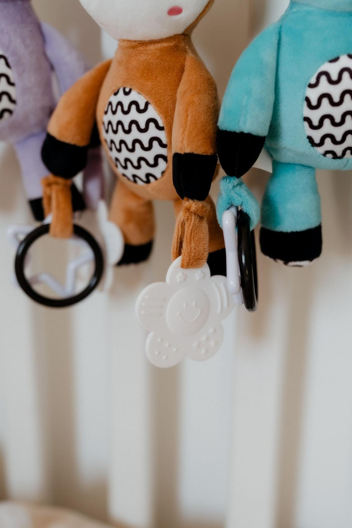 Zawieszka do wózka, która piszczy, grzechocze i wydaje dźwięk gniecionego papieru, może również służyć jako gryzak. Można ją prać w pralce w temperaturze 30 stopni.