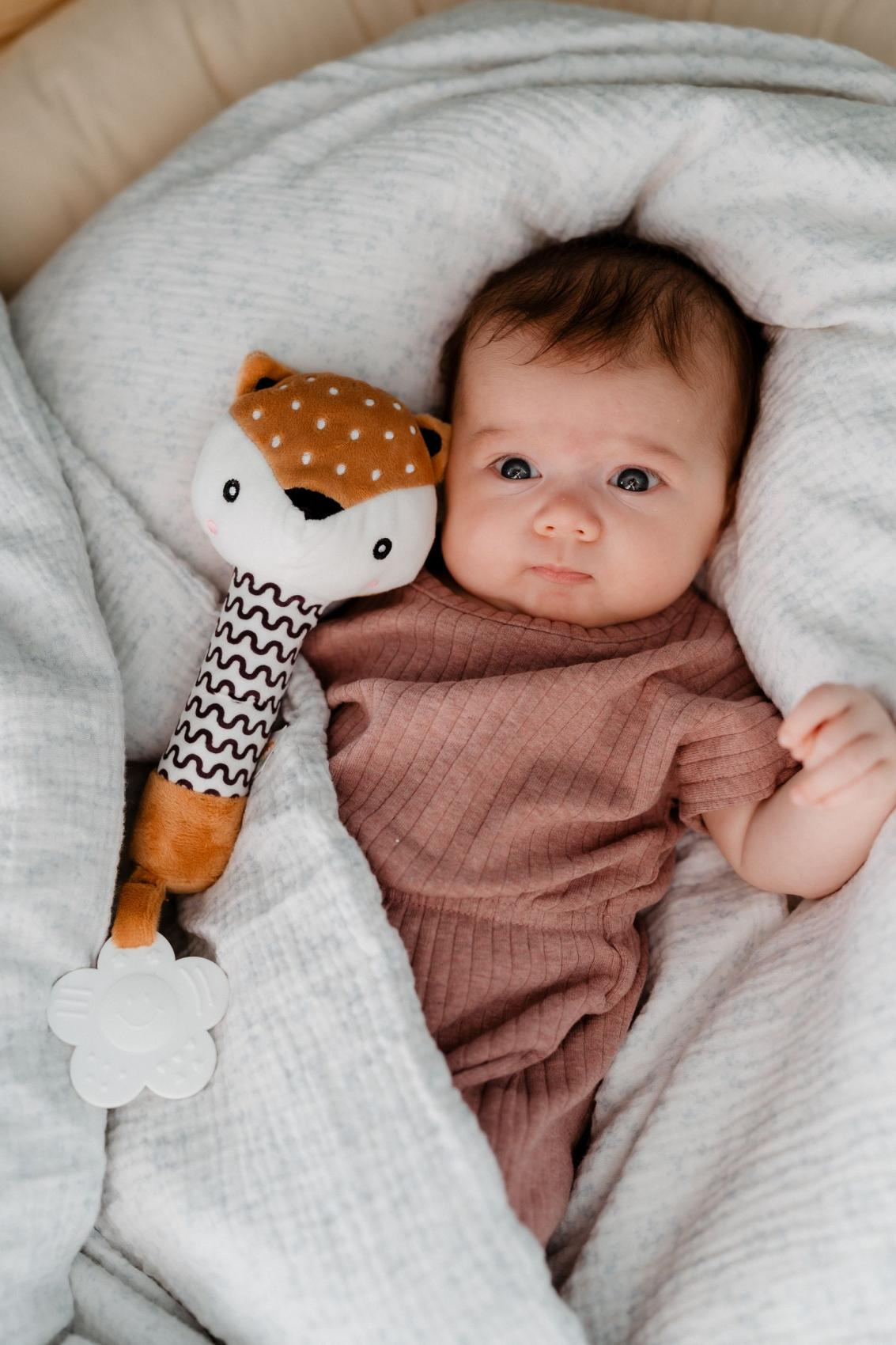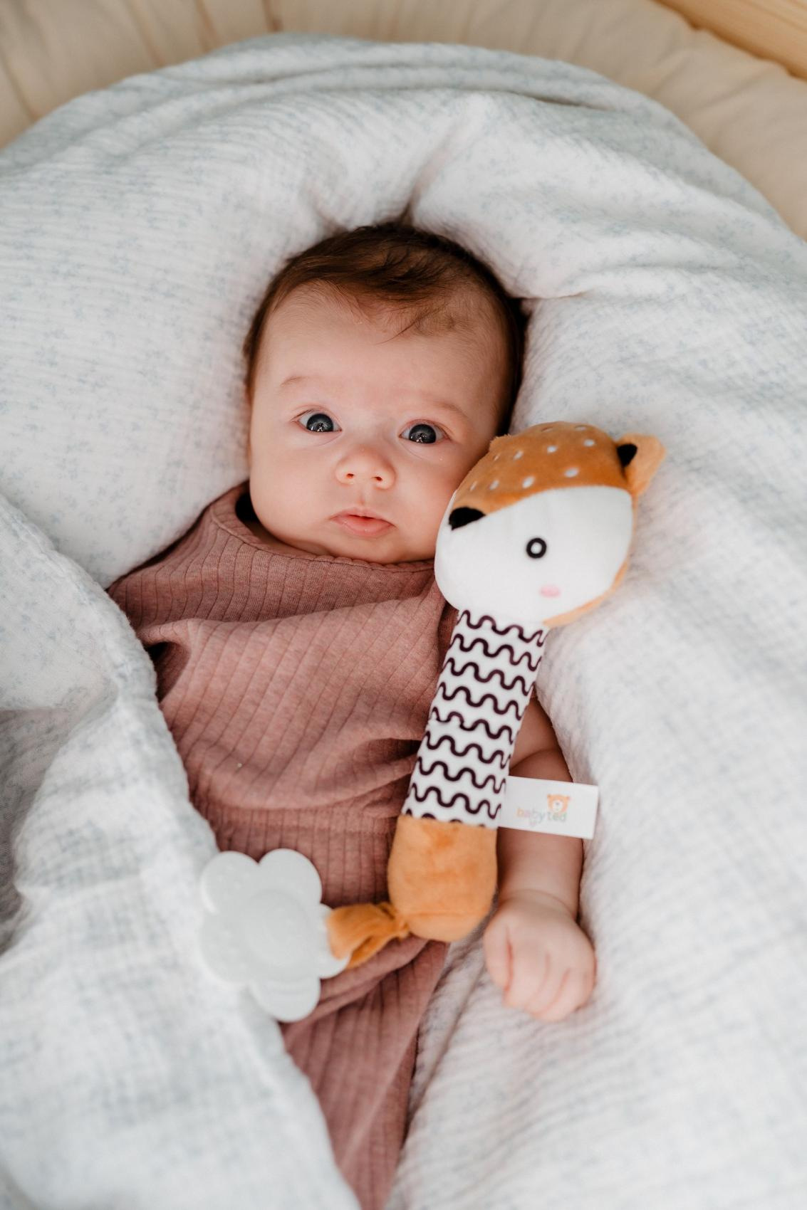 Roztomilý plyšový srneček je ideální první hračka pro miminka již od narození. Díky dlouhému a měkkému tělíčku se snadno drží v malých ručičkách a po stisku vydává jemný pískací zvuk, který podporuje sluchový rozvoj miminka a zaujme jeho pozornost. Na spodním konci hračky je umístěno měkké plastové kousátko ve tvaru kytičky, které uleví citlivým dásním při růstu prvních zoubků. Kontrastní černobílý vzor na tělíčku navíc podporuje vizuální vnímání nejmenších dětí. Srneček je vyroben z hebkého a bezpečného plyše, vhodného již od narození. Produkt je certifikován v ČR, což zaručuje splnění vysokých bezpečnostních standardů.