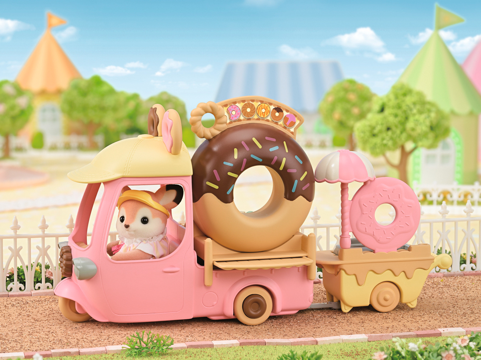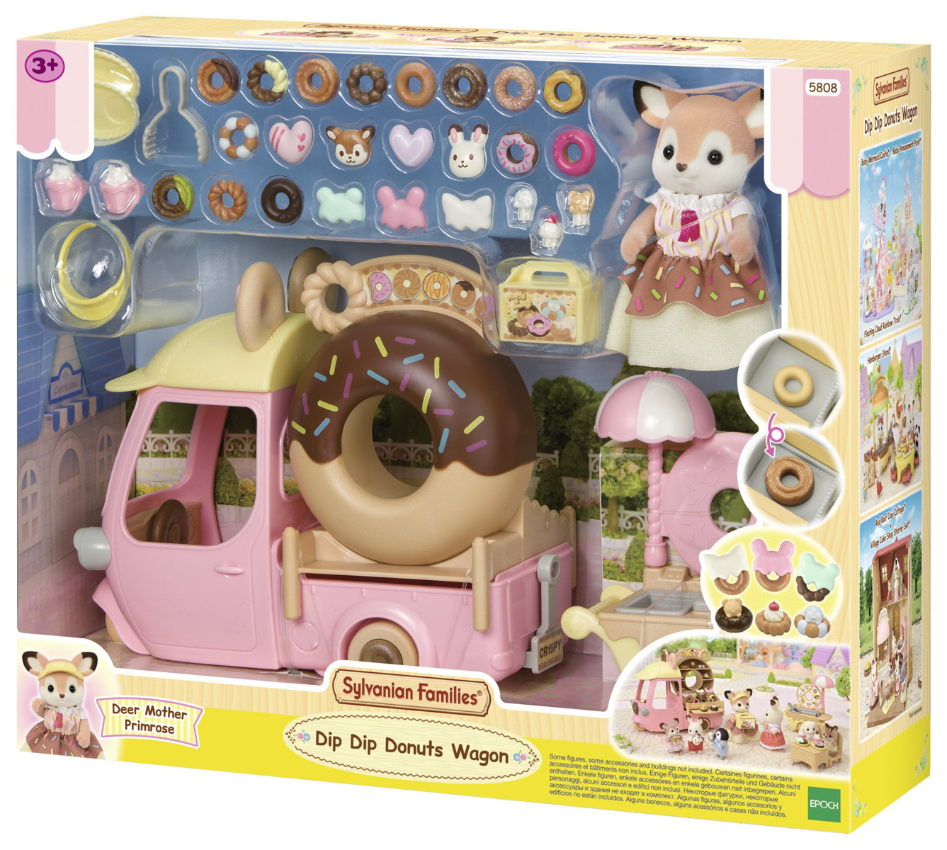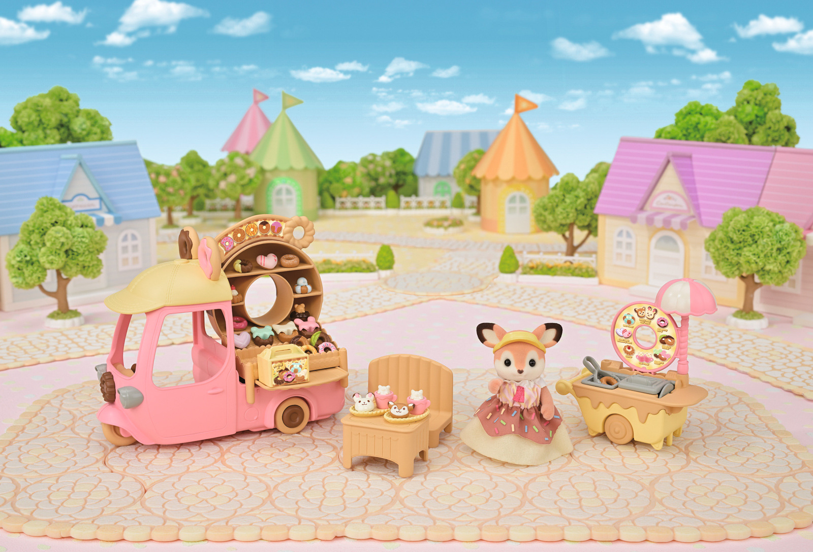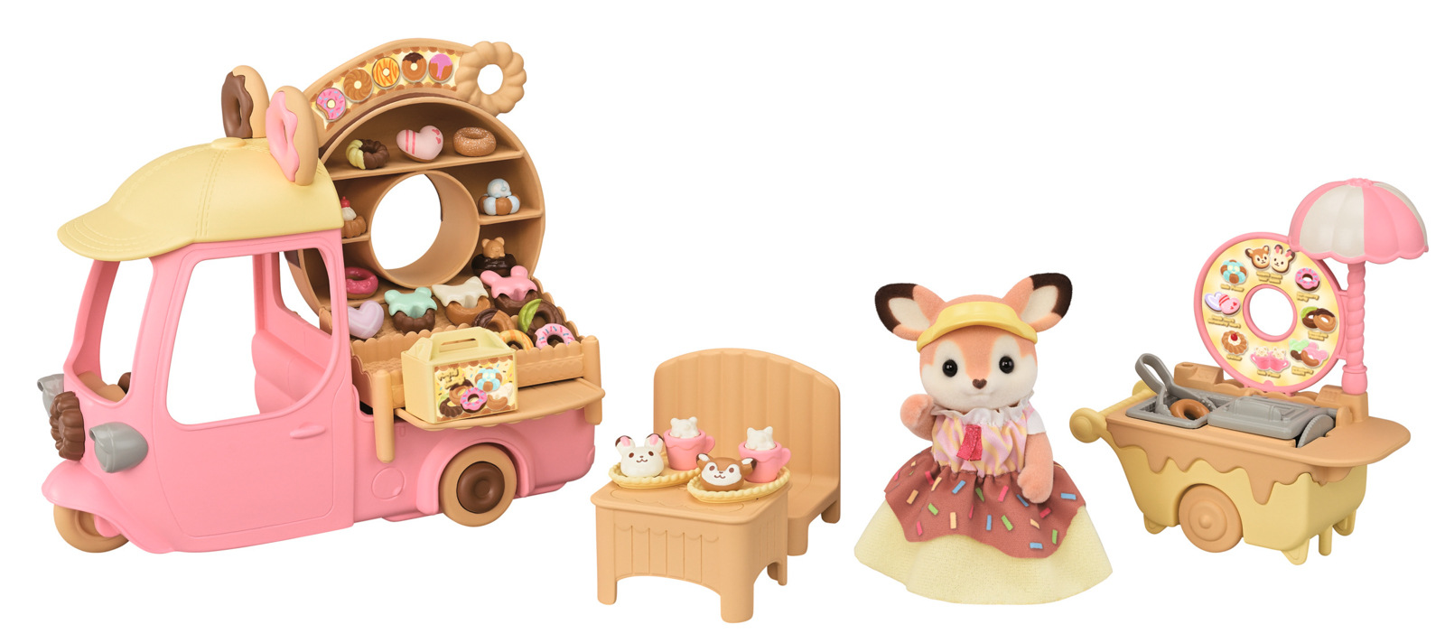 Zveme vás na lahodné donuty. Koblihový vozík s velkým kulatým donutem na střeše se objevil v Sylvanian Families. Když máma z rodiny Jelínků Primrose, přijíždí se svým koblihovým vozíkem, všichni milovníci sladkého pečiva se postaví do dlouhé fronty. Stačí pár kroků a vozík se změní na malý obchůdek s koblihami. Všechny donuty jsou připravovány na místě a zdobeny podle objednávky každého hosta. Sada obsahuje spoustu koblih různých tvarů a více než 30 doplňků. Jelení máma Primrose je oblečena v roztomilém kostýmu připomínajícím sladkou koblihu s barevným posypem. Stánek s donuty lze přeměnit na malý autobus pro děti z říše Sylvanian Families. Sada obsahuje také vozík s prostorem na smažení a zdobení koblihových dobrot. Hračky Sylvanian Families rozvíjejí představivost a povzbuzují děti k hraní rolí. Hra s figurkami rozvíjí kreativitu a učí emocím vytvářením a vyprávěním příběhů založených na každodenních zážitcích a pozorování světa. Vyznačují se nejvyšší kvalitou a výjimečným důrazem na