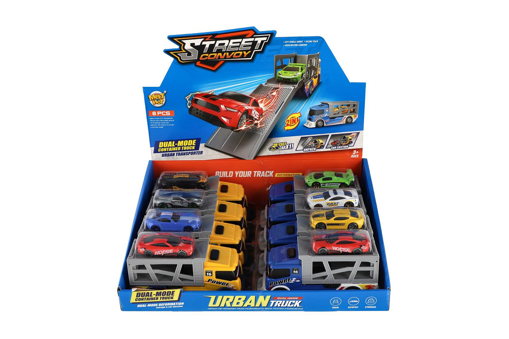 Opis Teddies Auto ciężarówka transporter + auto plastikowe 15cm na wolny bieg 2 kolory 8 sztuk w pudełku