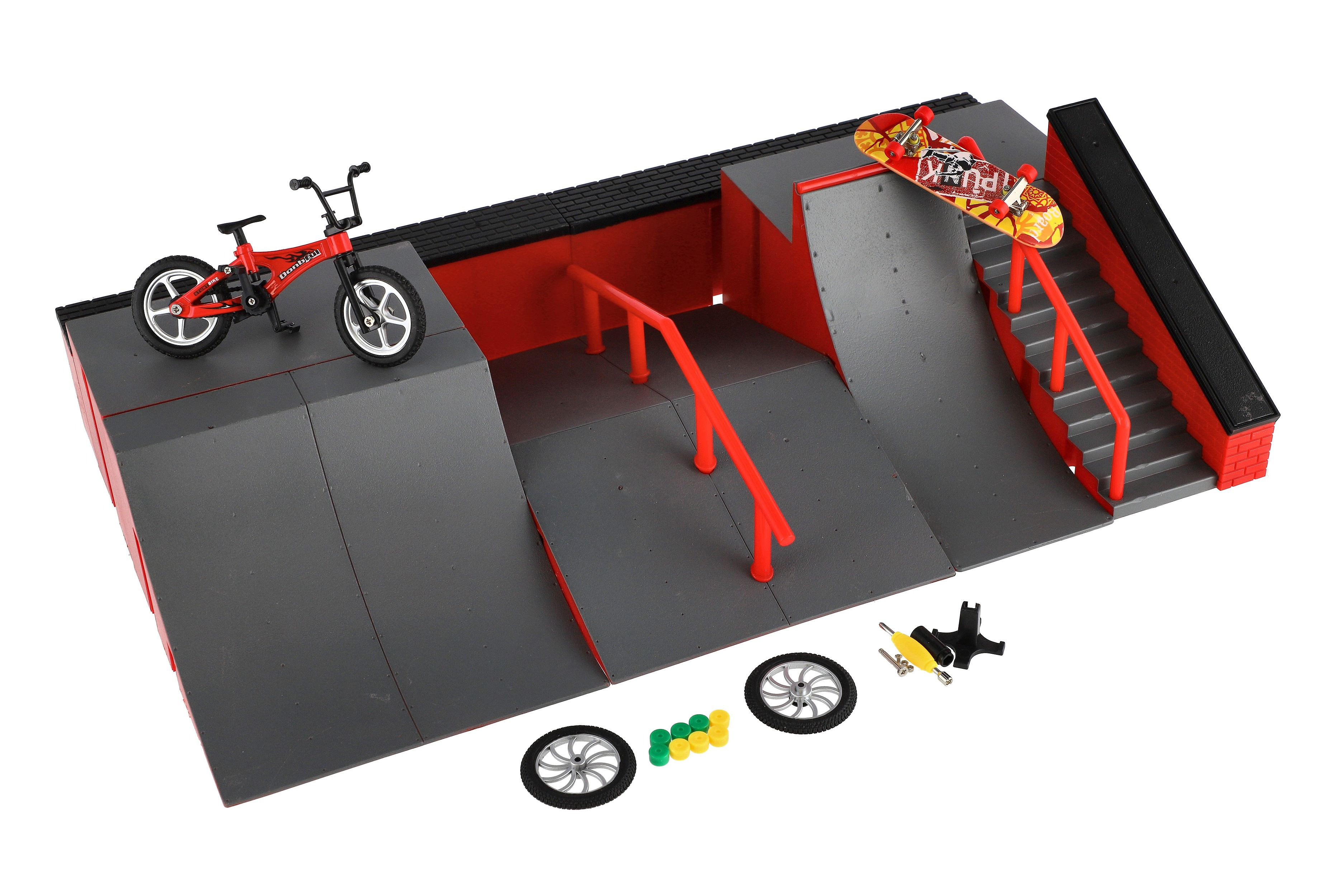 Opis Teddies Skatepark - rampy, rowerek finger, deskorolka finger plastik z akcesoriami 2 kolory w pudełku 43x25x12cm