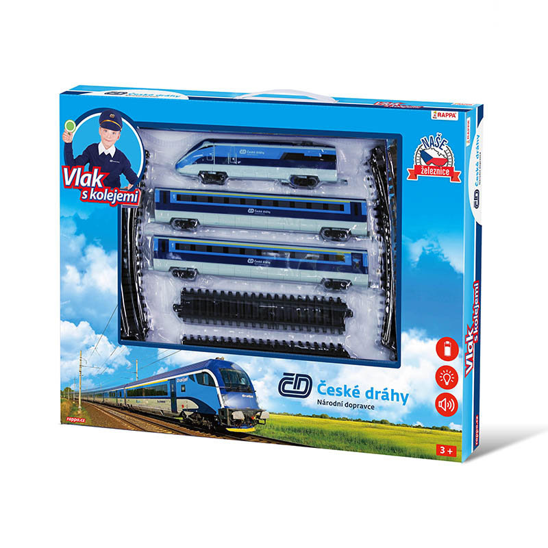 Sada z kolekce Naše železnice obsahuje lokomotivu, dva vagóny, 12 zahnutých a 8 rovných kolejí. Lokomotiva měří na délku 23,5 cm a vagón 30 cm. Lokomotiva jezdí, vydává zvuk a svítí díky 2 ks AA baterií (nejsou součástí balení). Celková dráha kolejí měří 4,8 m a jejich rozteč je 2,1 cm. Velikost koleje rovné je 23 cm a zahnuté 25 cm. Tuto novinku lze kombinovat s vlakem RegioJet. Touto originální vlakovou sadou Českých drah určitě potěšíte všechny milovníky a nadšence železnic. Koleje a výhybky je možné dokoupit samostatně.
