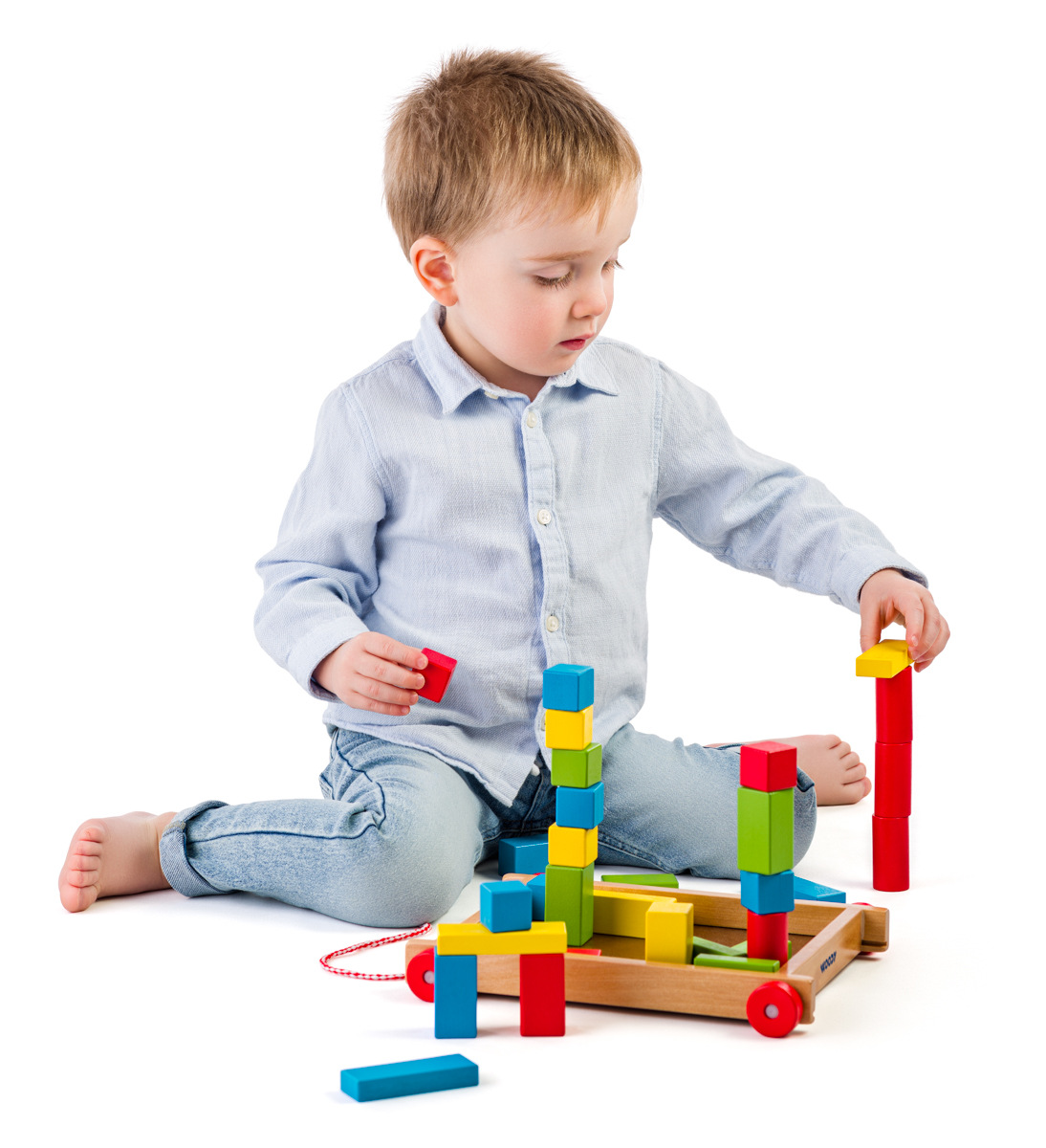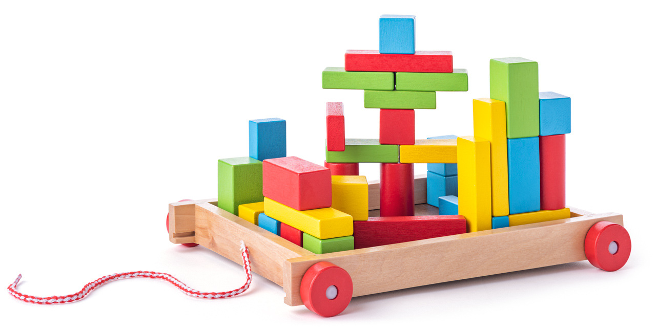 35 drewnianych klocków umieszczonych w drewnianym wózku. 12 z nich ma dwie strony z tworzywa sztucznego i kolorowe litery, dzięki czemu mogą służyć również jako znaczki. Pozostałe kostki są kolorowe z nadrukiem. | Wiek: 3+ Rozmiar: 27 x 24 x 6 cm