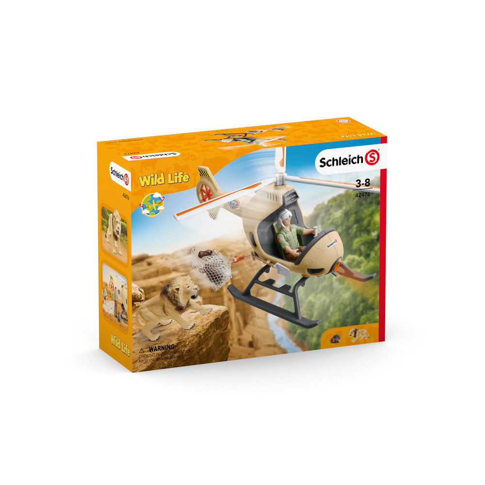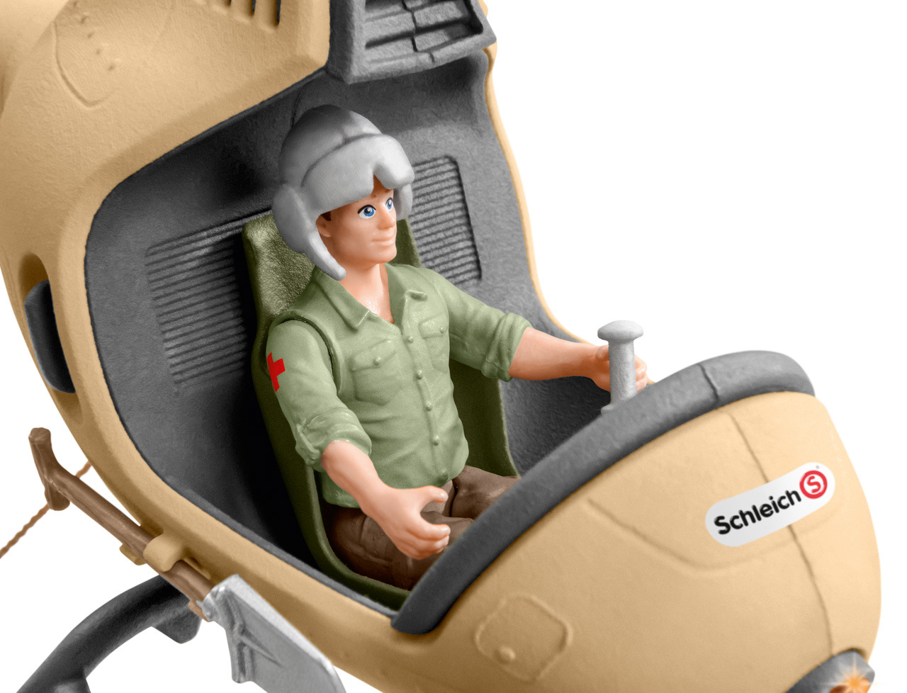 Dzięki nowemu helikopterowi ratunkowemu od Schleich® Wild Life strażnik może uratować młode hipopotama przed lwem z głębokiego wąwozu. Strażnik opuszcza siatkę transportową ze śmigłowca za pomocą wciągarki linowej. Młody hipopotam wspiął się na siatkę w ostatniej sekundzie, a strażnik błyskawicznie odleciał od lwa. Akcja ratunkowa zakończyła się sukcesem.