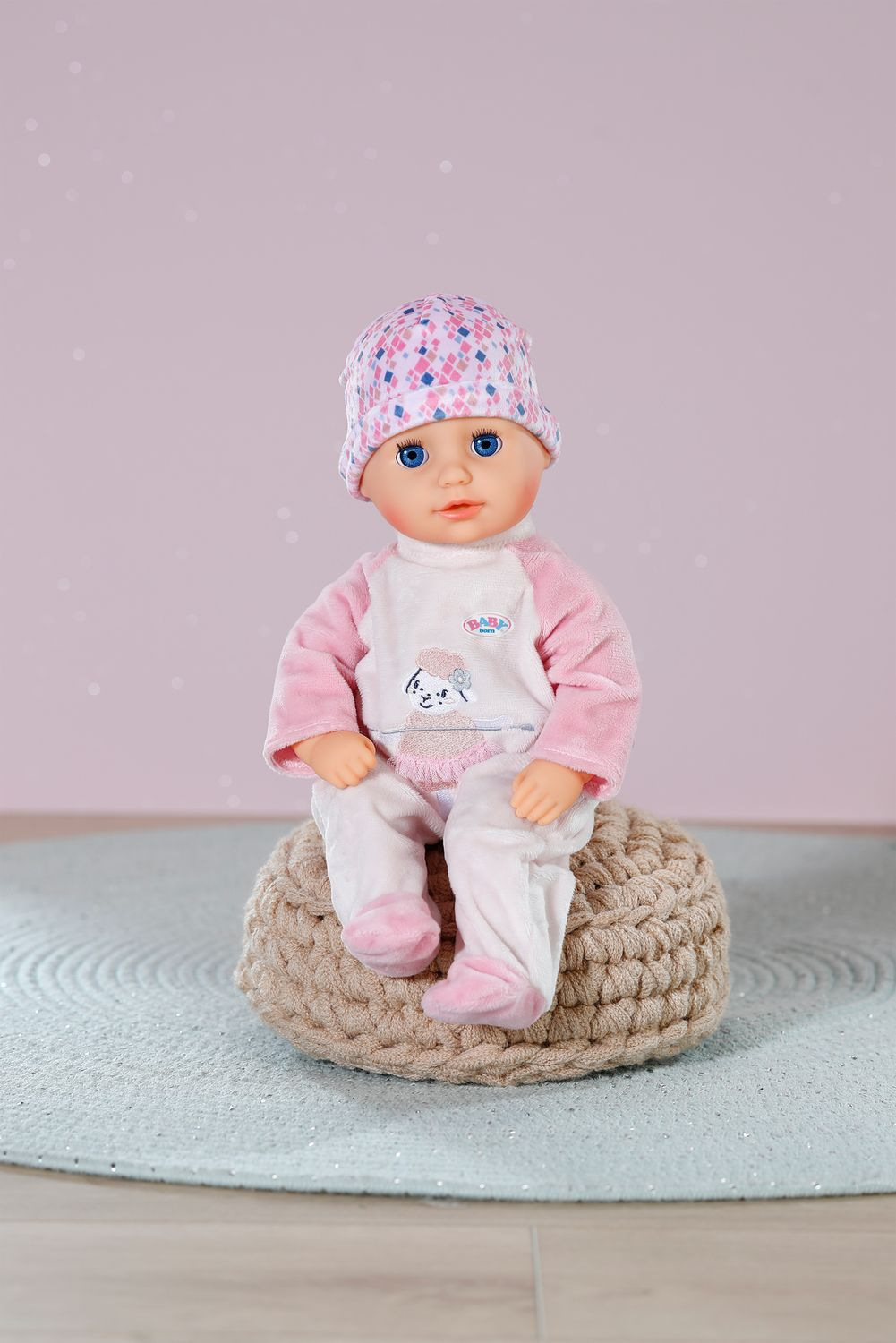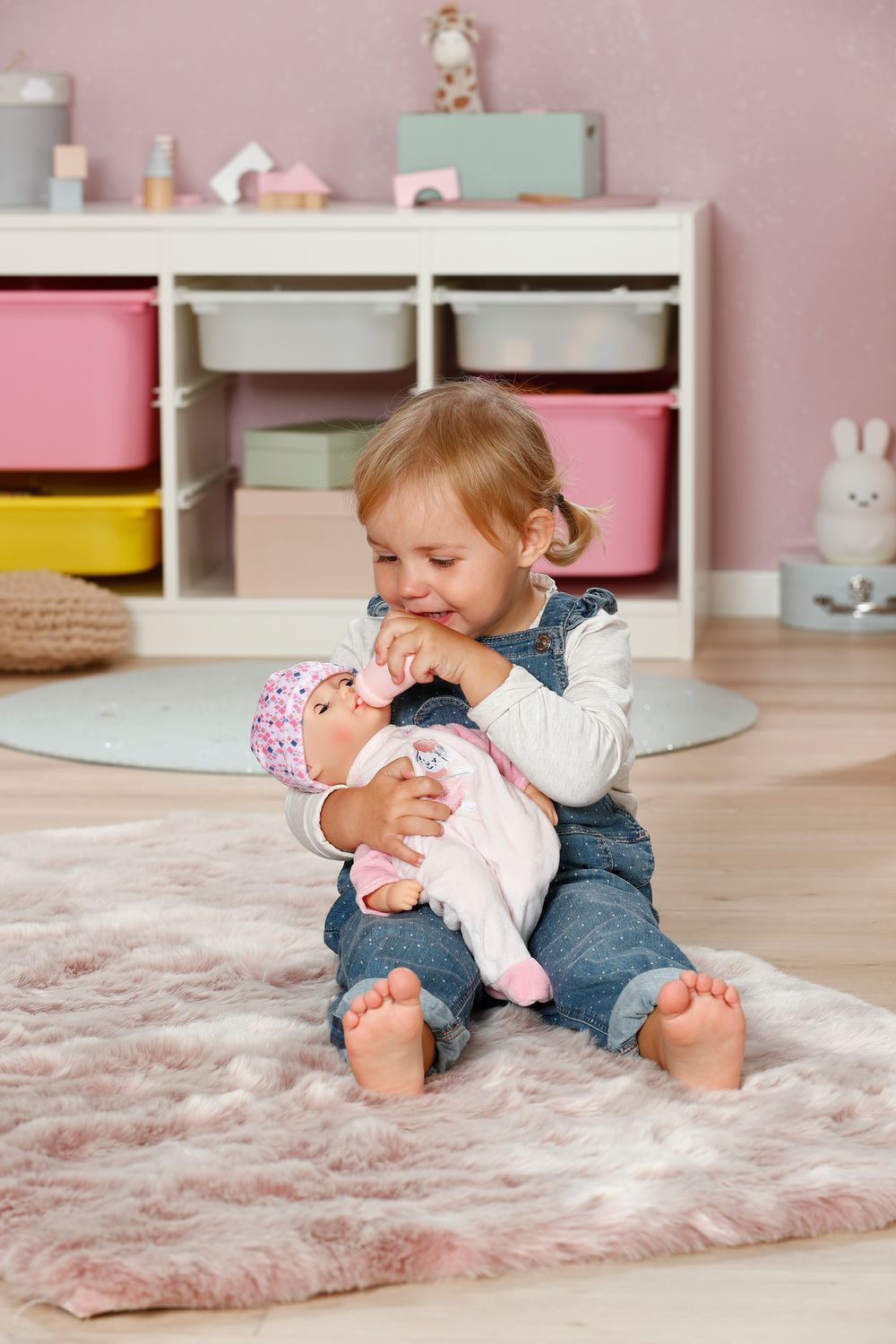 BABY born Anna, s kterou se můžete mazlit. Má měkké látkové tělíčko a díky praktické velikosti je ideální první kamarádkou pro ty nejmenší. Pokud ji po lahvičce uložíte na odpolední spánek, její oči se jemně zavřou a může v klidu spát. Dupačky okouzlí pastelovými barvami a roztomilými detaily. Nosí dupačky ve dvou odstínech růžové a má i růžovou lahvičku. Sladěná čepička dokonale doplňuje její oblečení a připravuje ji na každé dobrodružství a mazlení. Všechny doplňky od BABY born velikosti 36 cm jí dokonale sedí. • Má měkké tělíčko na mazlení • Mrkací oči • Součástí je lahvička, dupačky a čepička • Vhodné pro děti od 1 roku
