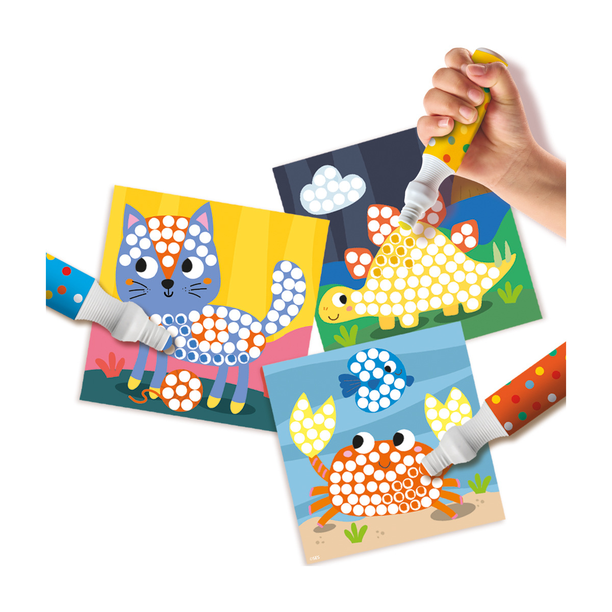 Odkryj zestaw markerów kropkowych i kart aktywności - idealny do kreatywnych i zabawnych zajęć artystycznych. Zestaw zawiera trzy markery XXL w kolorze żółtym, pomarańczowym i niebieskim. Zawiera 6 zabawnych kart z szablonem do kolorowania kropek i nieograniczonej ekspresji twórczej. Zmywalne farby sprawiają, że malowanie jest dla dzieci łatwe i bezstresowe. Kolory mogą łatwo ulec wypłukaniu. Zestaw ten poprawia sprawność motoryki małej i uczy rozpoznawania wzorców poprzez wesołe zabawy plastyczne. Wymiary opakowania: 20 x 20 x 4 cm. Wiek: 3+