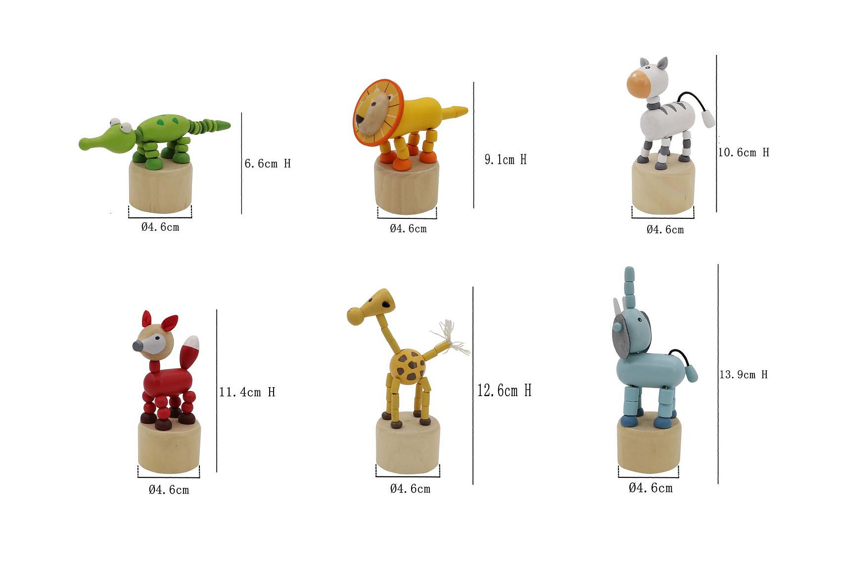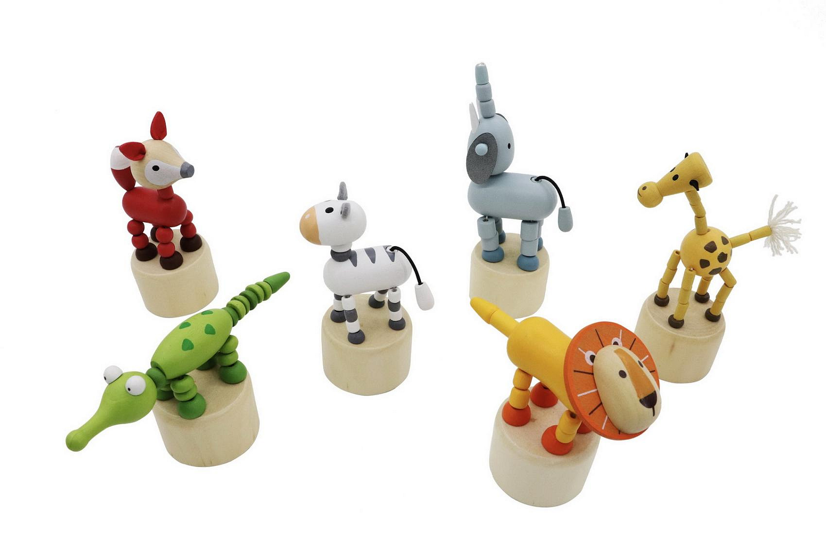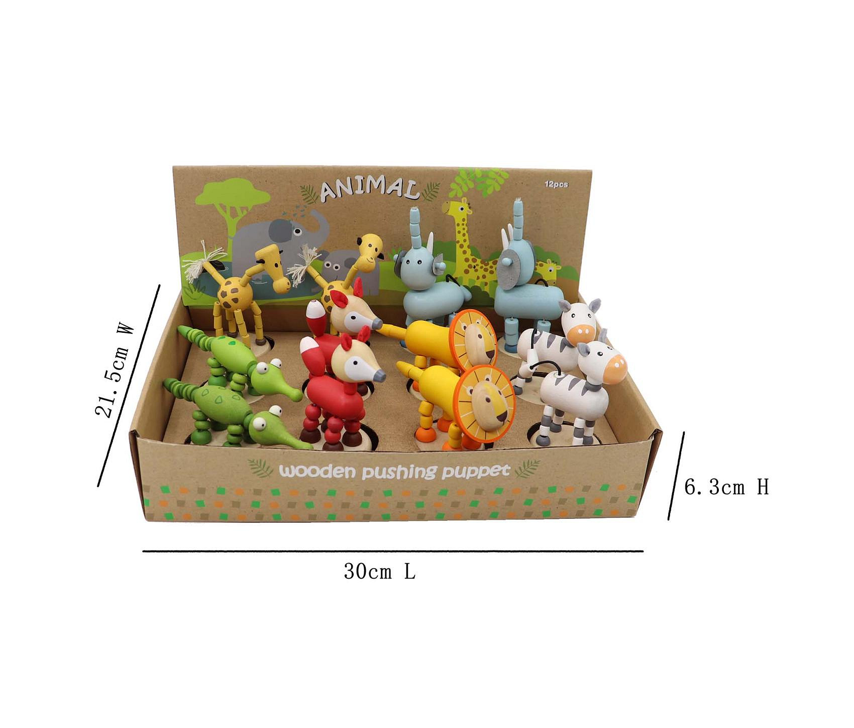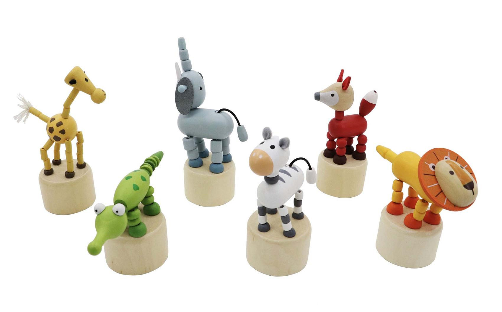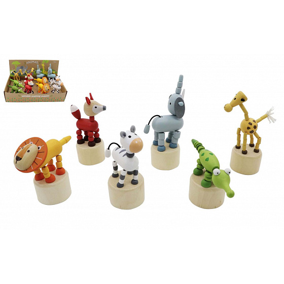 Mačkací zvířátko safari dřevěné. Rozměry (4,6-9,2)x(4,6-6,0)x(9,3-14,3) cm. 12 ks display box. 6 variant - žirafa, slon, lev, zebra, krokodýl, liška.