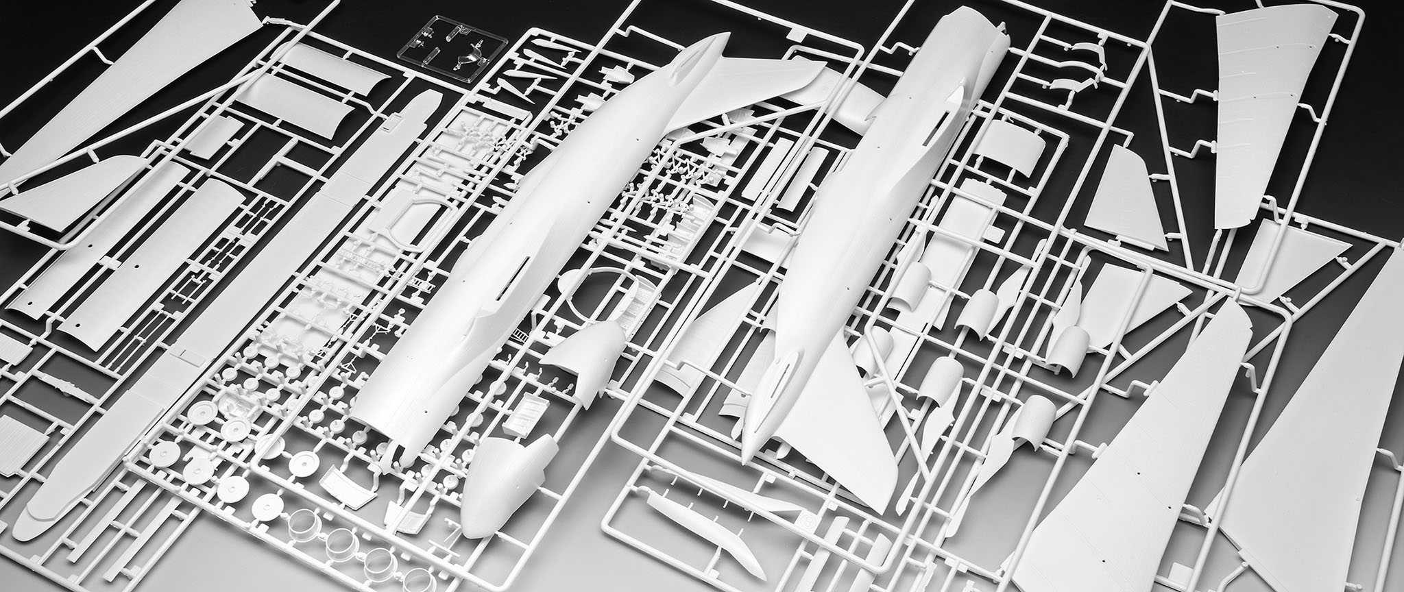 Model letadla ke slepení. Velikost: 1:144; 47,8 cm. Balení obsahuje: 178 dílků ke slepení. Detail