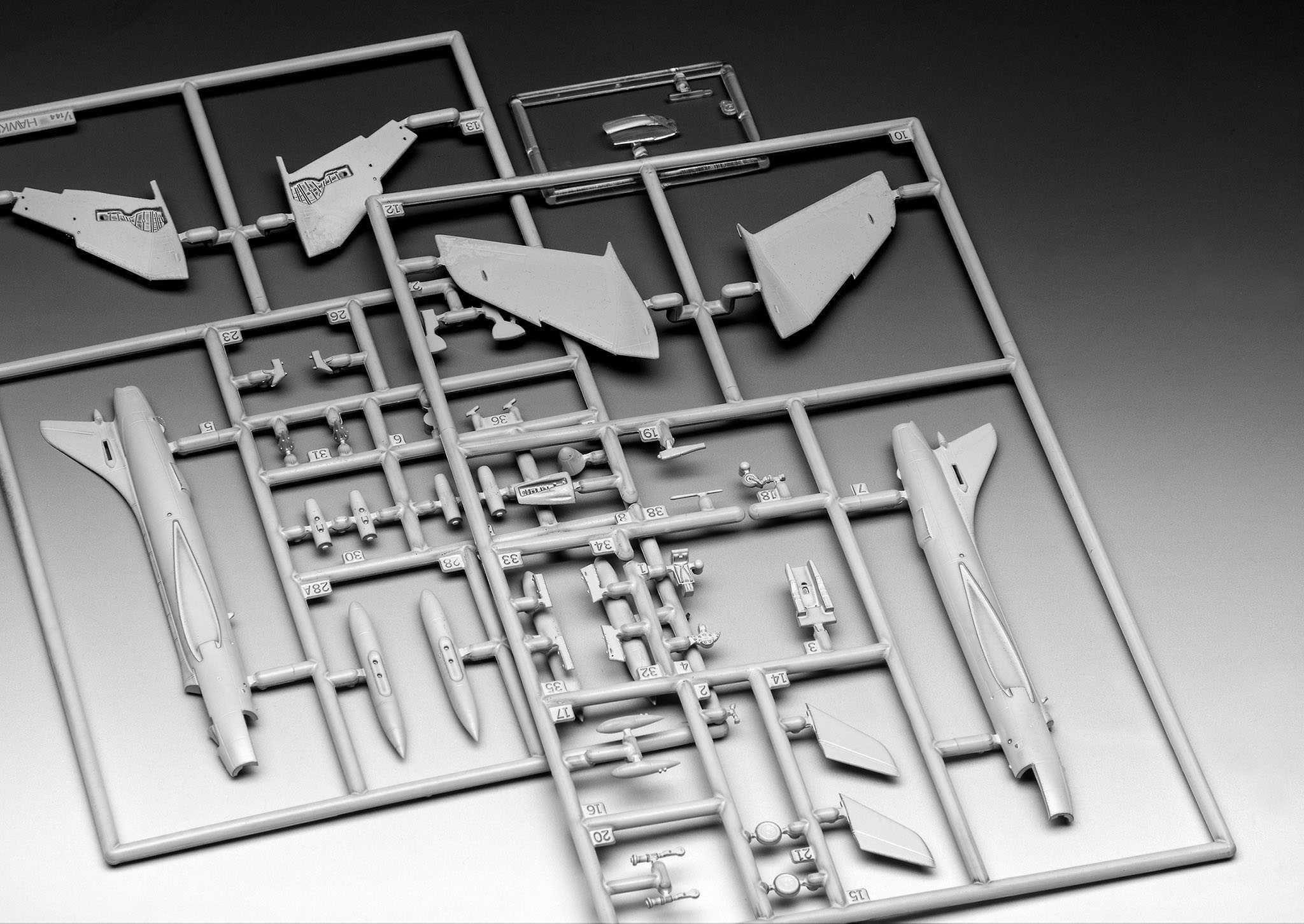 Plastový model (nesestavený), ilustrovaný vícejazyčný návod na sestavení, obtisky
