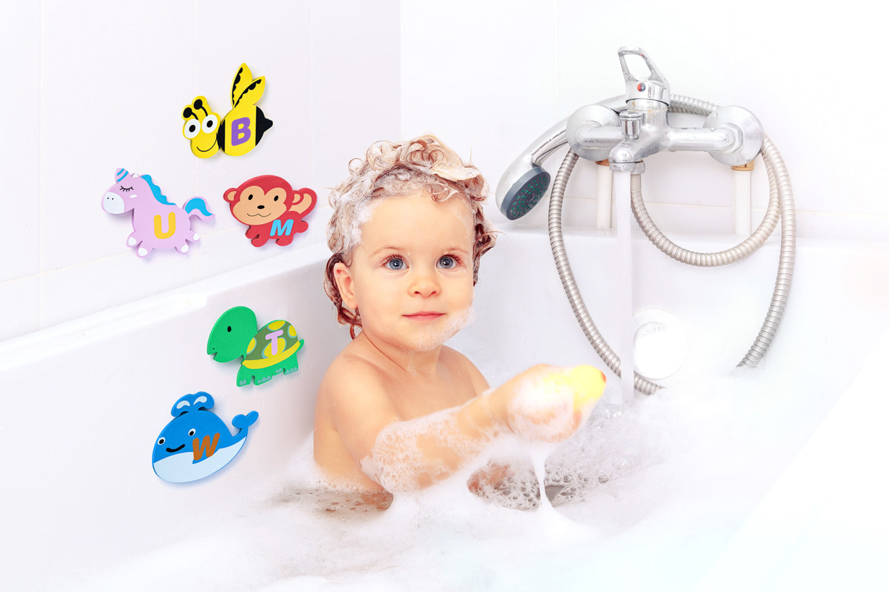 Pěnové puzzle ve tvaru zvířátek jsou určeny především pro zpestření večerního koupání ve vaně. Děti si zvířátka prohlížejí, ohmatávají, okusují, povídají si s nimi a lepí je kolem sebe na vanu a na dlaždičky. V balení 26 ks. Věk: 3+