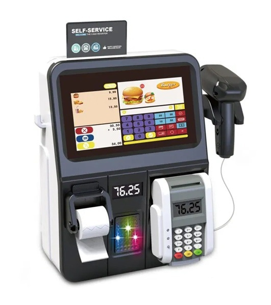 Velká samoobslužná pokladna: Tohle je to nejlepší! Zákazníci si na ní můžou naklikat, co chtějí – třeba šťavnatý hamburger, křupavý sendvič nebo osvěžující pitíčko. A hele, všechno tohle jídlo najdeš rovnou v balení!