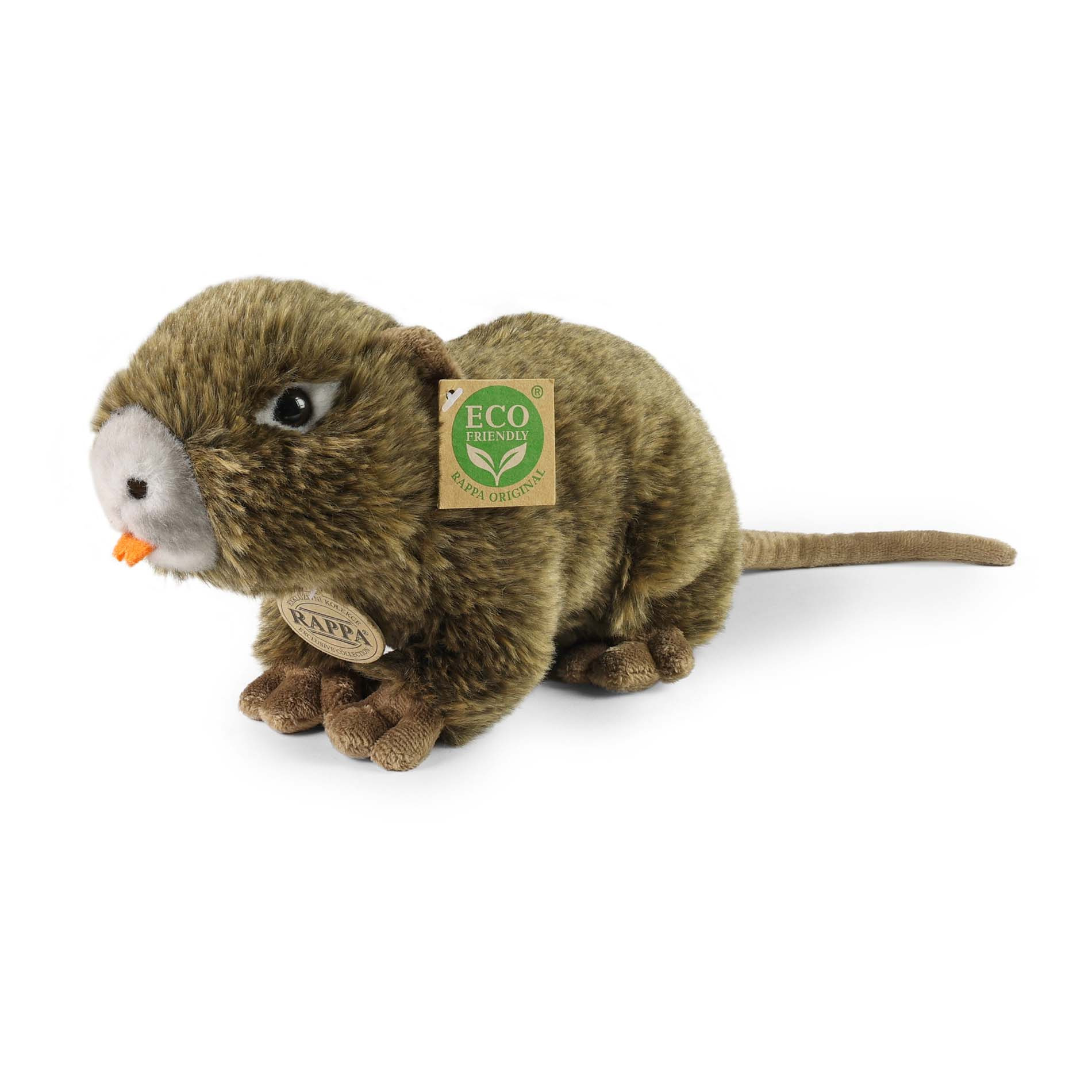 Plyšová nutrie měří 24 cm a díky těm nejkvalitnějším materiálům se řadí do Exkluzivní kolekce plyšových hraček značky Rappa. Díky ručnímu zpracování každého kusu navíc vypadá jako živá. Proč označení ECO-FRIENDLY? Rappa si je vědoma všech dopadů na životního prostředí, zaměřuje se na udržitelnost a omezení používání plastů na minimum. Proto je výplň hraček vyrobena z recyklovaných materiálů, zejména PET lahví. Ta je však zcela nezávadná a vhodná i pro děti od narození. FUN FACT: Věděli jste, že nutrie mají zvláštně oranžové zuby díky vysokému obsahu železa ve sklovině?