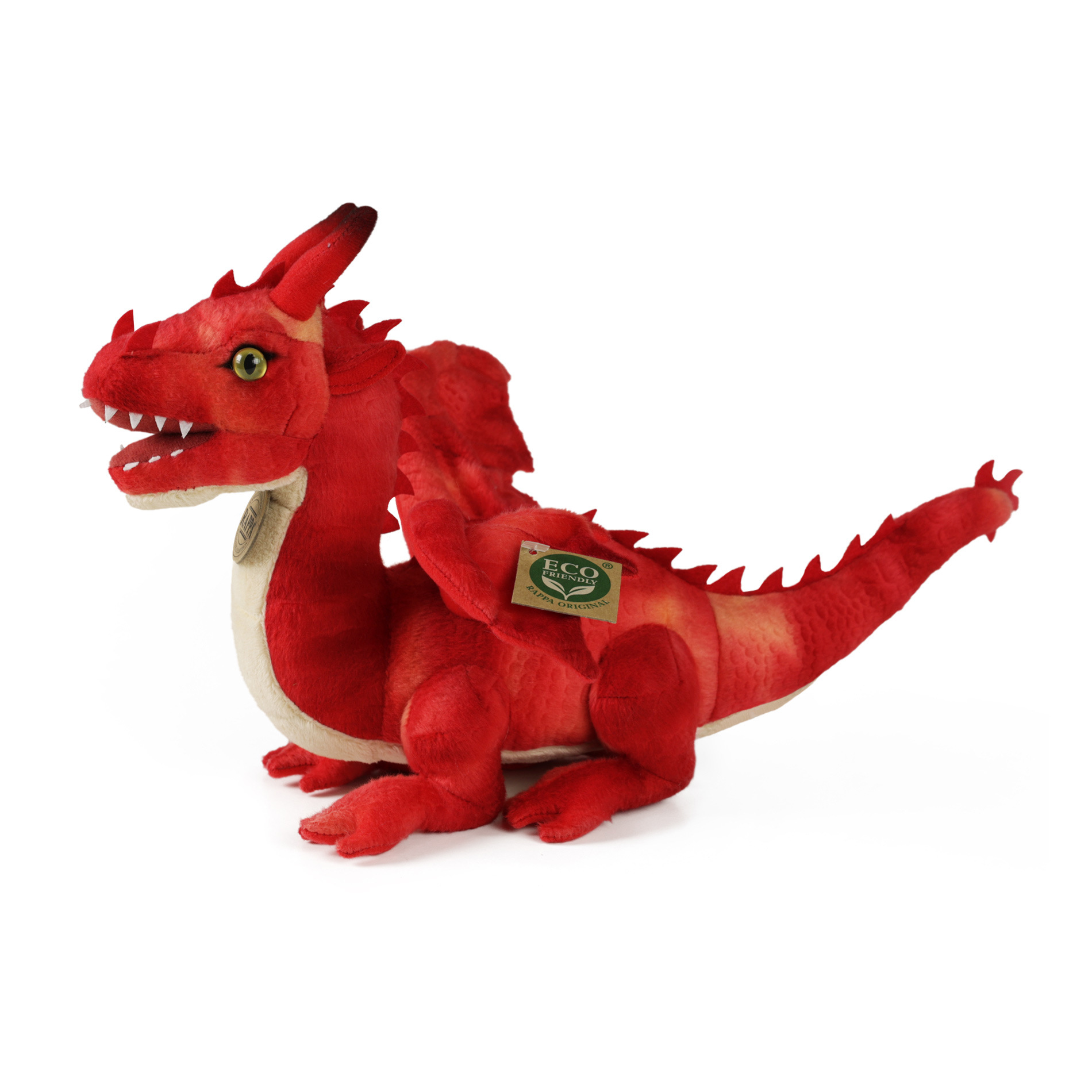 Nádherný plyšový drak červený o délce 40 cm. Drak je vyroben z vysoce kvalitní plyše a je tak součástí exkluzivní kolekce plyšových hraček RAPPA. Rozhodli jsme se jít zelenou cestou co nejméně zatěžující životní prostředí - cestou ECO-FRIENDLY. Co to vlastně ECO-FRIENDLY znamená? Výplň plyšové hračky je vyrobena z recyklovaných PET lahví. Tento materiál je zcela bezpečný, na omak nerozeznatelný od standardní výplně a plně atestovaný pro bezpečnost i těch nejmenších.