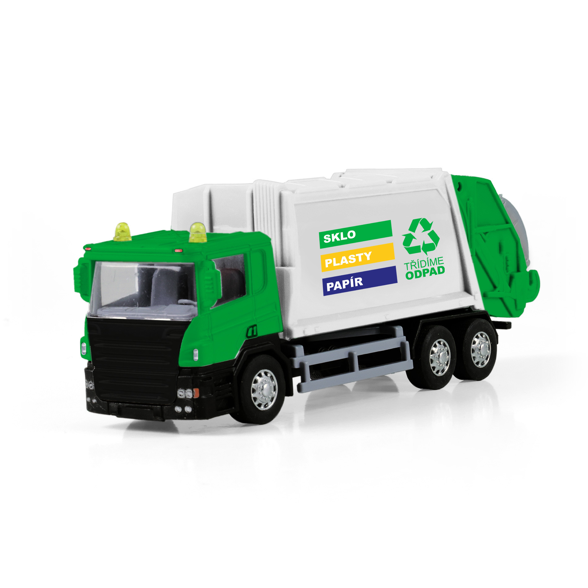 Kovové popelářské auto s plastovou korbou. Korba má v zadní části odklápěcí dveře, součástí je oteví