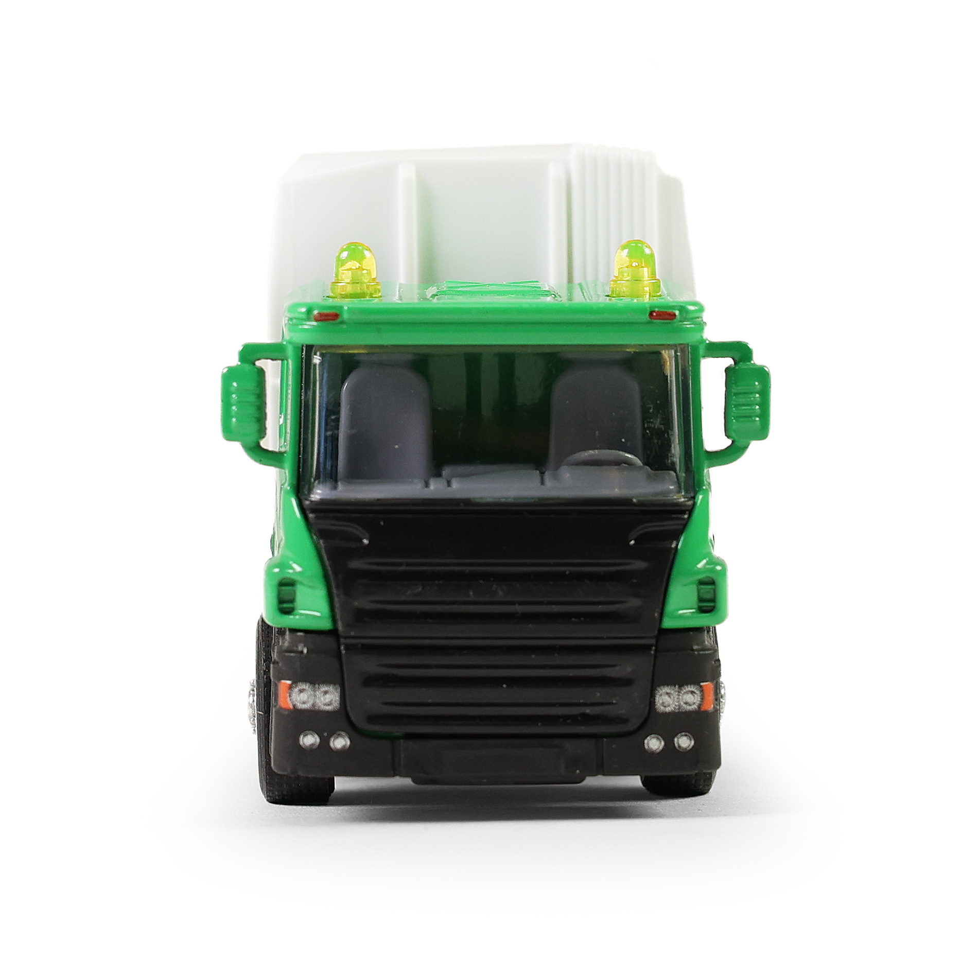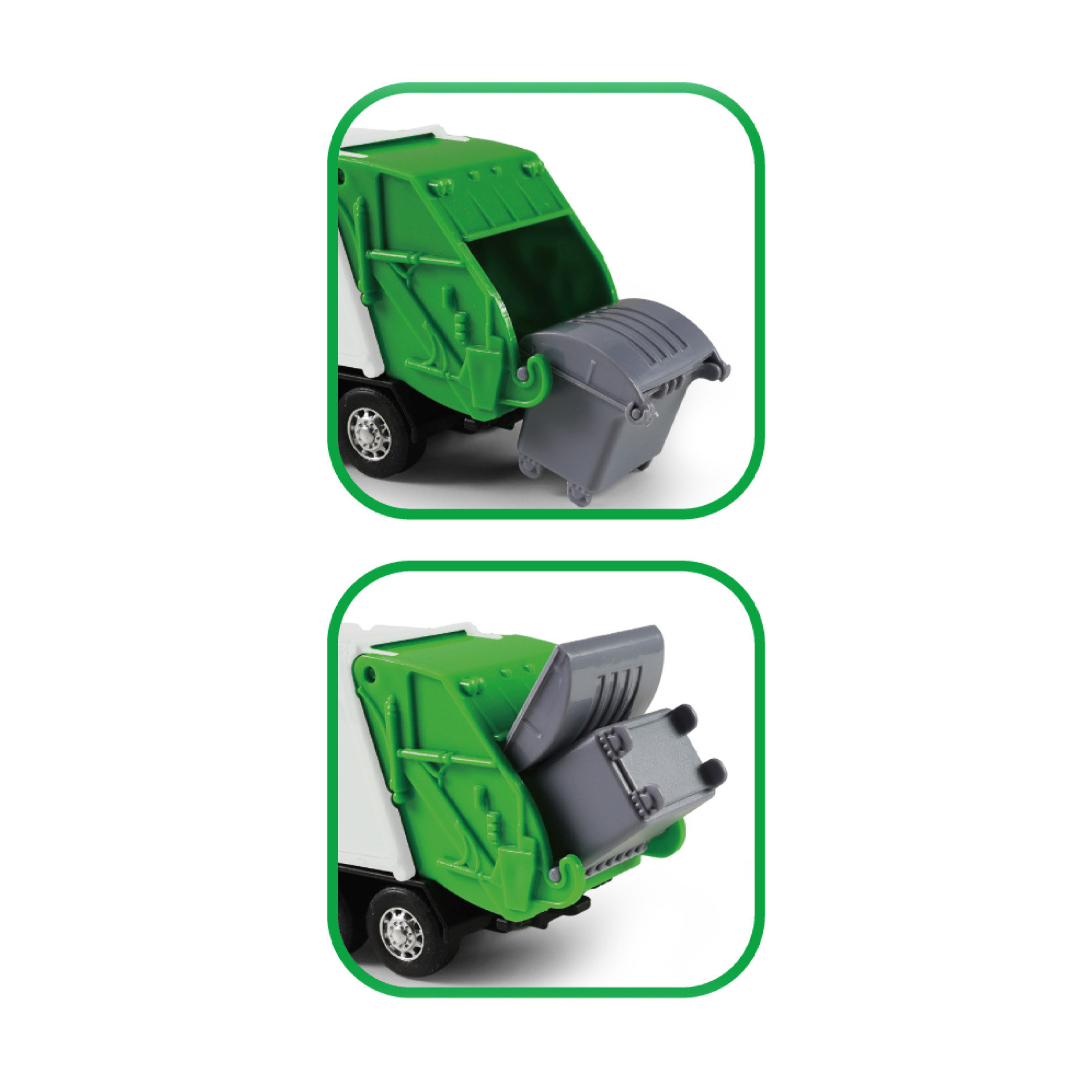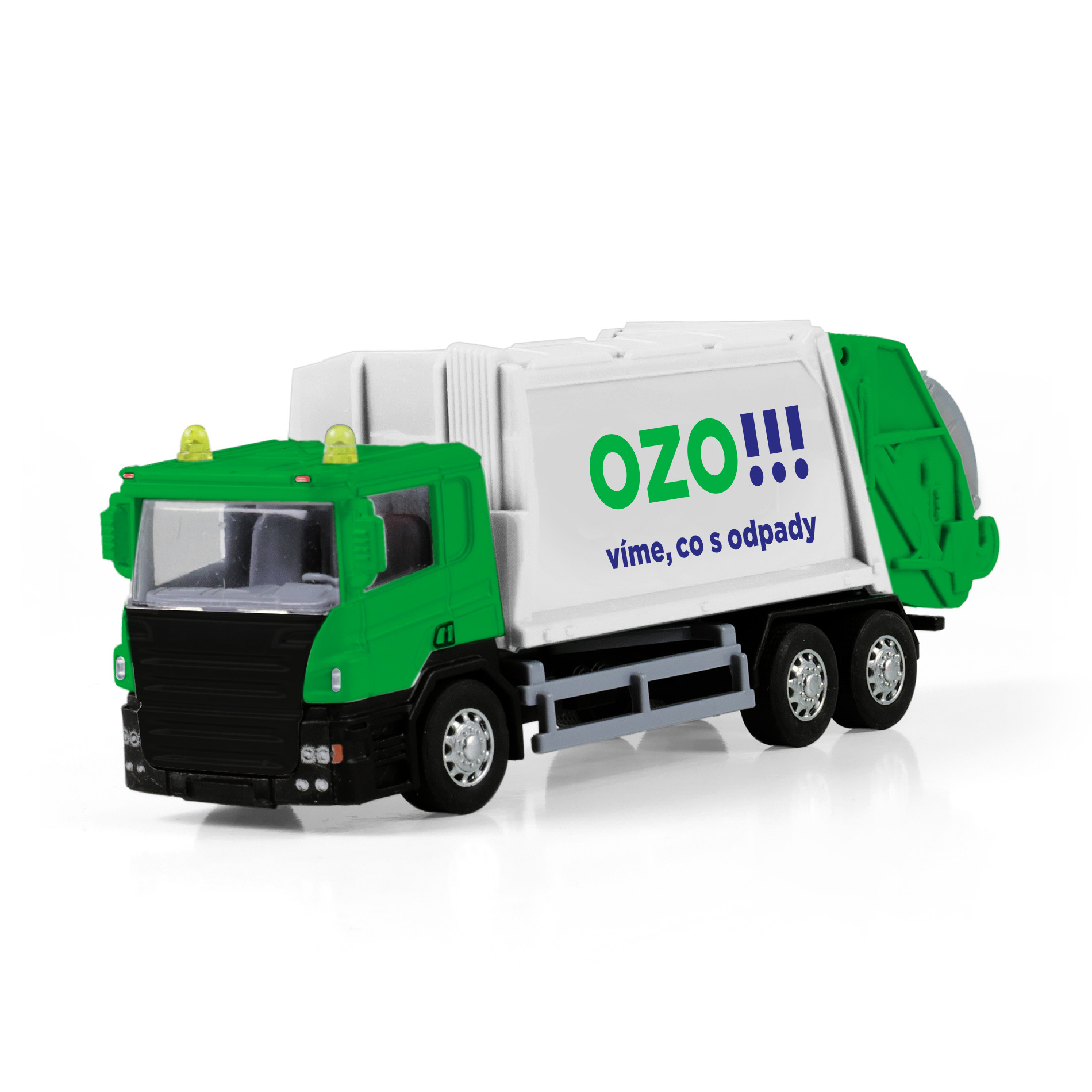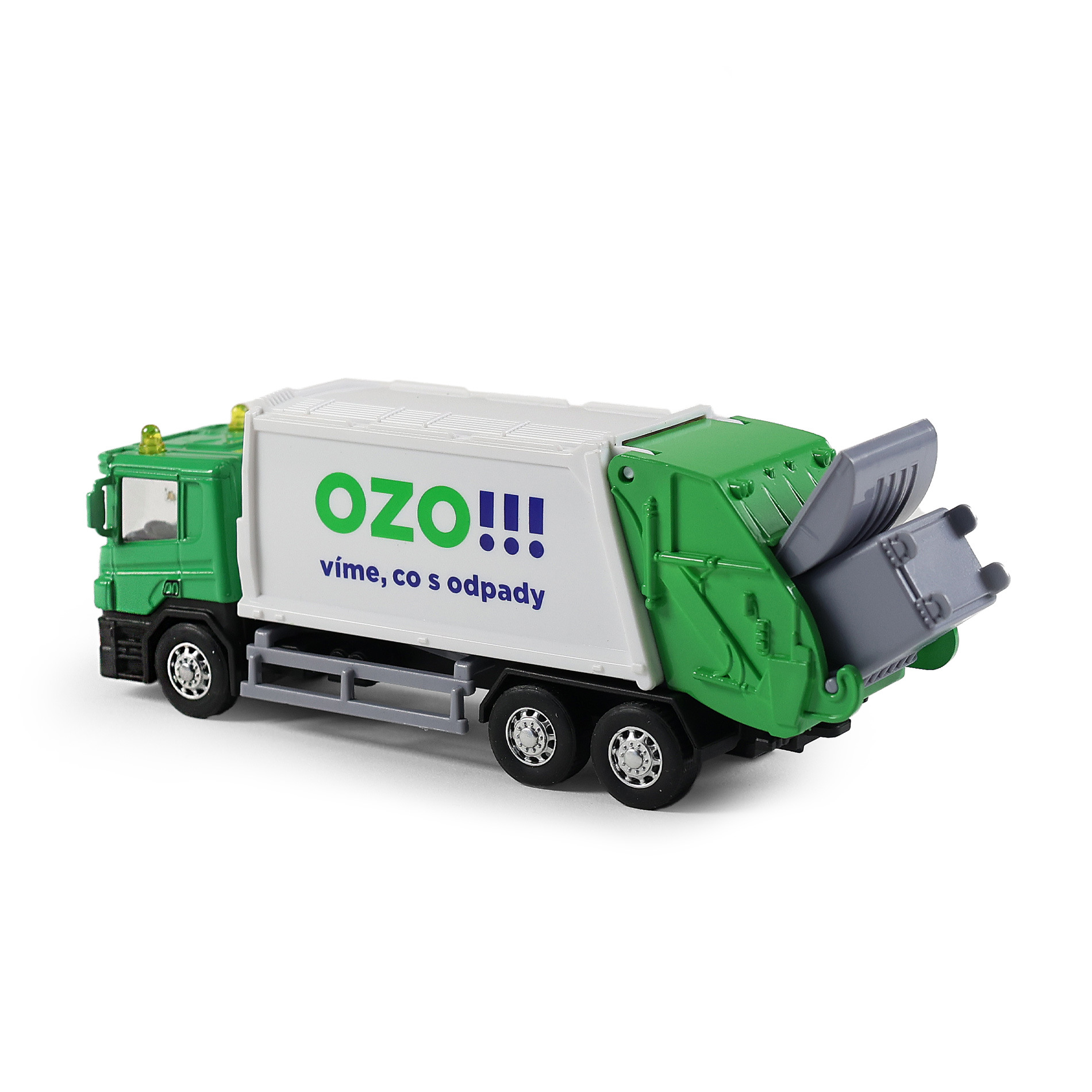 Kovové popelářské auto s plastovou korbou a logem OZO!!!. Korba má v zadní části odklápěcí dveře, součástí je otevírací popelnice. Auto jezdí na zpětný chod a jeho délka je 15 cm.